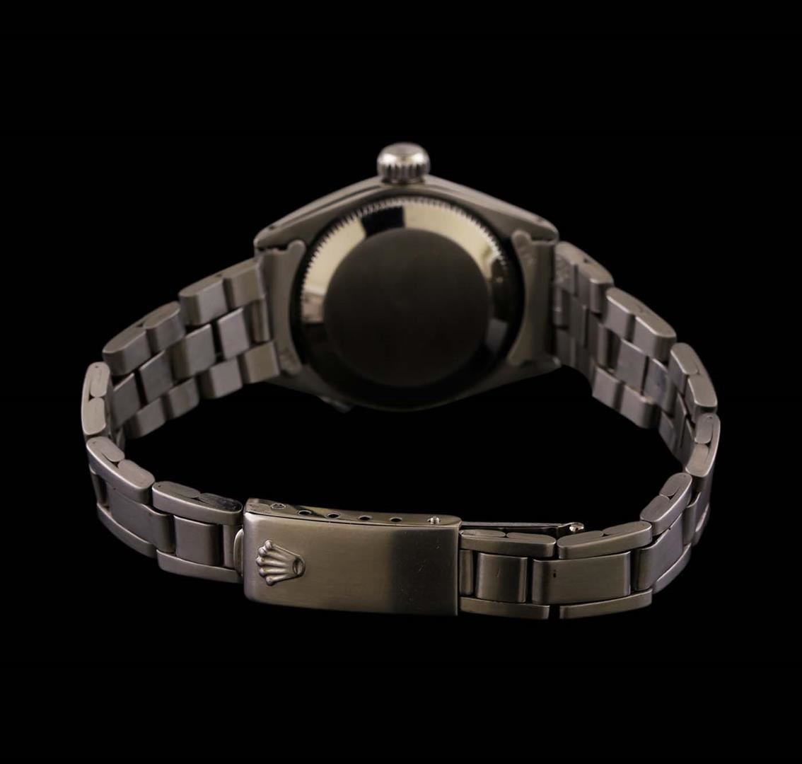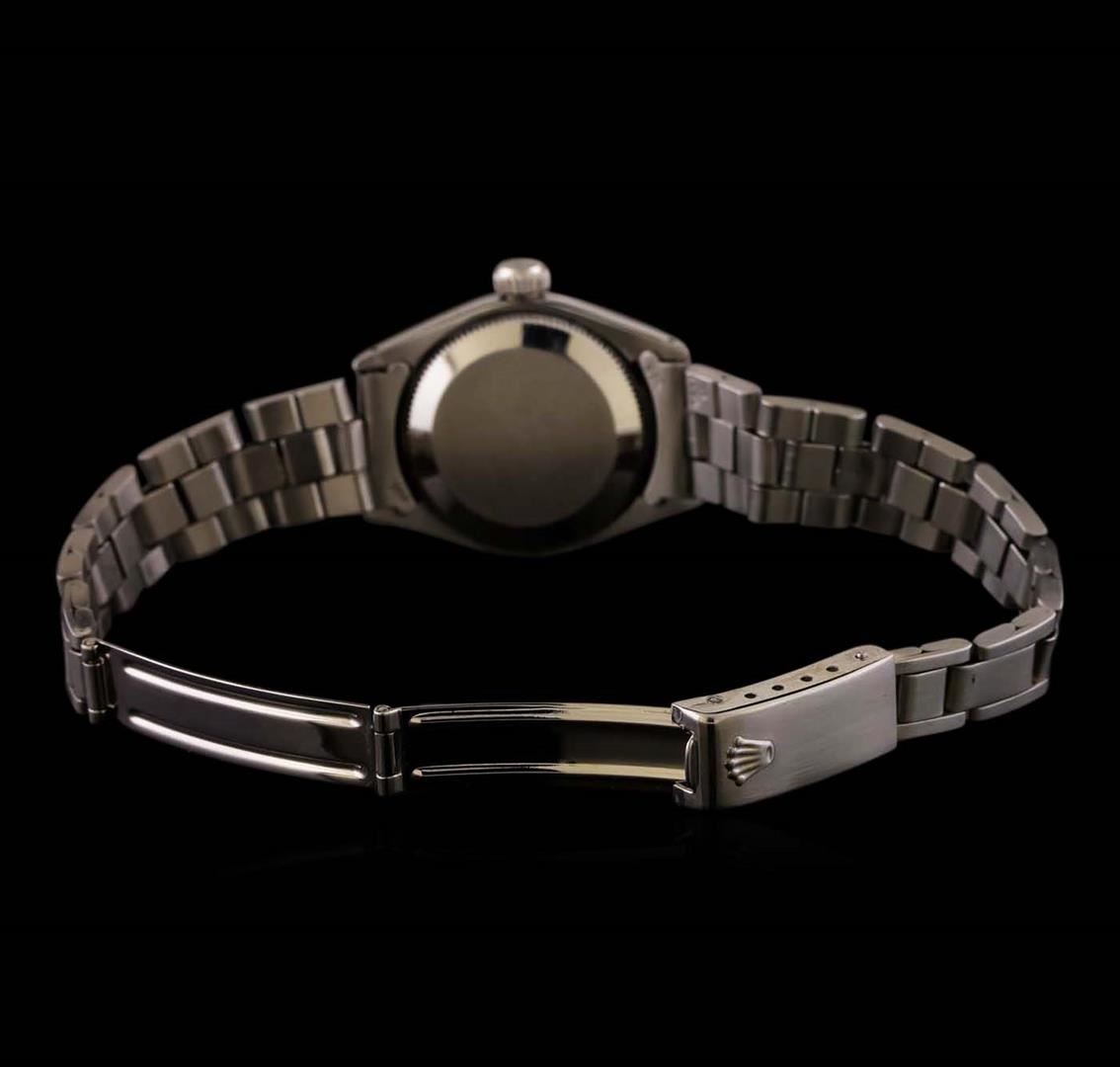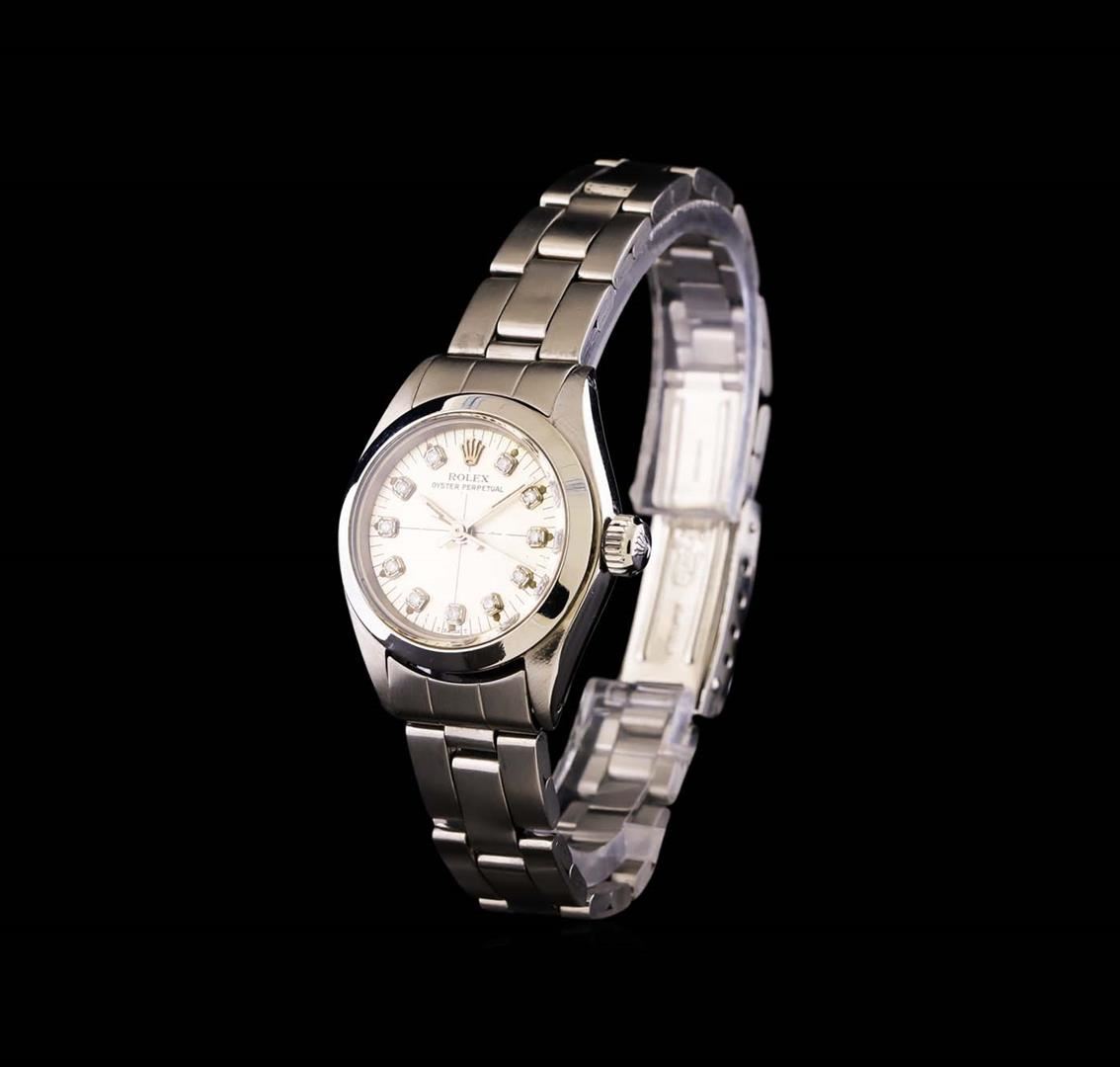 One ladies, hand crafted & machine milled Rolex Oyster Perpetual model Stainless Steel wristwatch electronically tested, Case: 25mm oyster, Crown: twinlock with logo, Bezel: high polish finish, Custom Crystal: acrylic lens. Movement: mechanical stem wind, Custom Dial: Silvered, with baton hands, minute indices, and diamond markers, Circa: 1973, Condition: G-4 Average, Bracelet: brushed finish stainless steel tapering oyster link. Six and three quarter inch length, adjustable. Standard clasp, with logo. Total Weight of Watch 38.73 grams. AIG Appraised at $2,990.00.