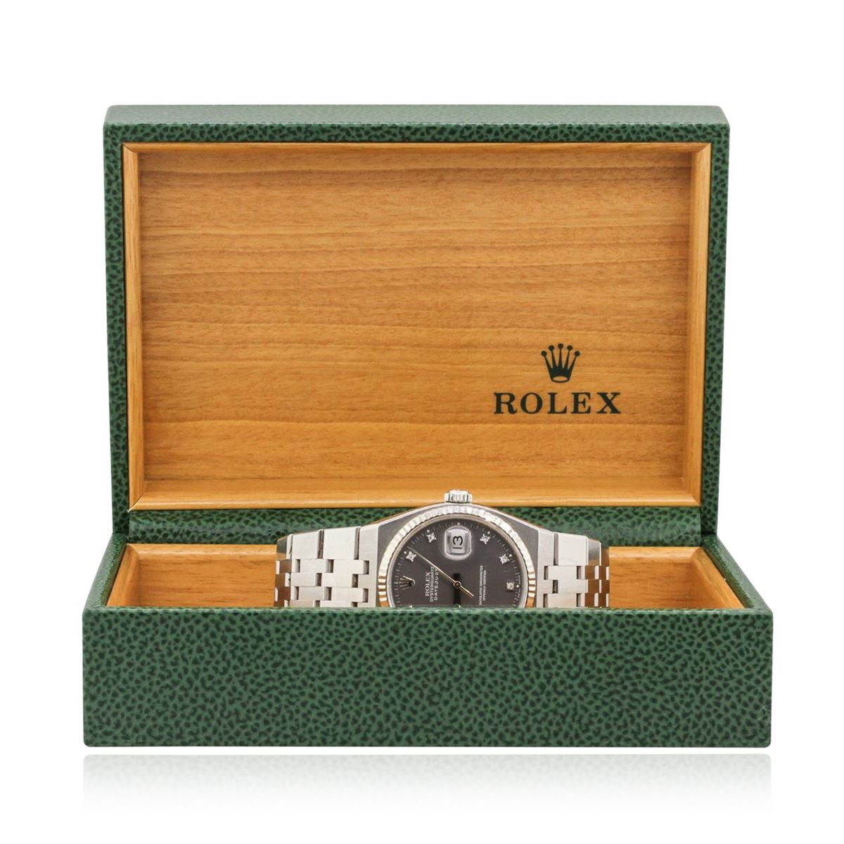 One gents, hand crafted & machine milled Rolex OysterQuartz DateJust wristwatch electronically tested Stainless Steel, Case: 36mm OysterQuartz, Crown: twinlock with logo, Bezel: fluted, Crystal: synthetic sapphire cyclops lens. Movement: Swiss quartz chronometer, Dial: Slate color, with baton hands and diamond markers, Date Window: 3 o'clock position, quick set, Bracelet: Stainless Steel OysterQuartz, Condition: G-5 Fine. Bright polish and brushed finish. Eight inch length, adjustable. Circa: 1992. Total Weight of Watch 123.98 grams. AIG Appraised at $4,240.00.