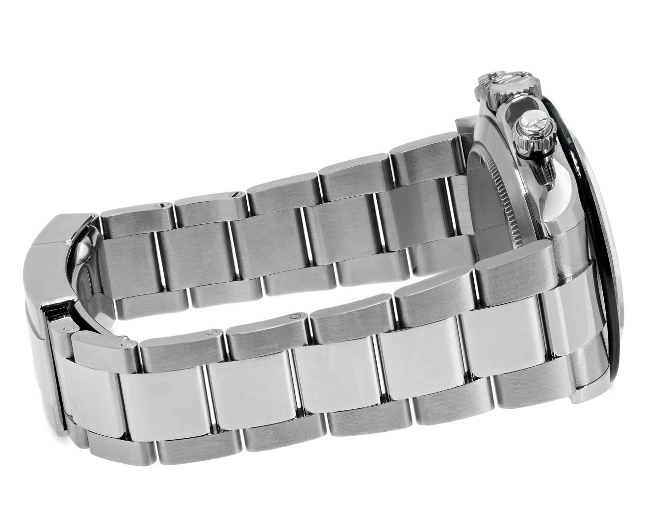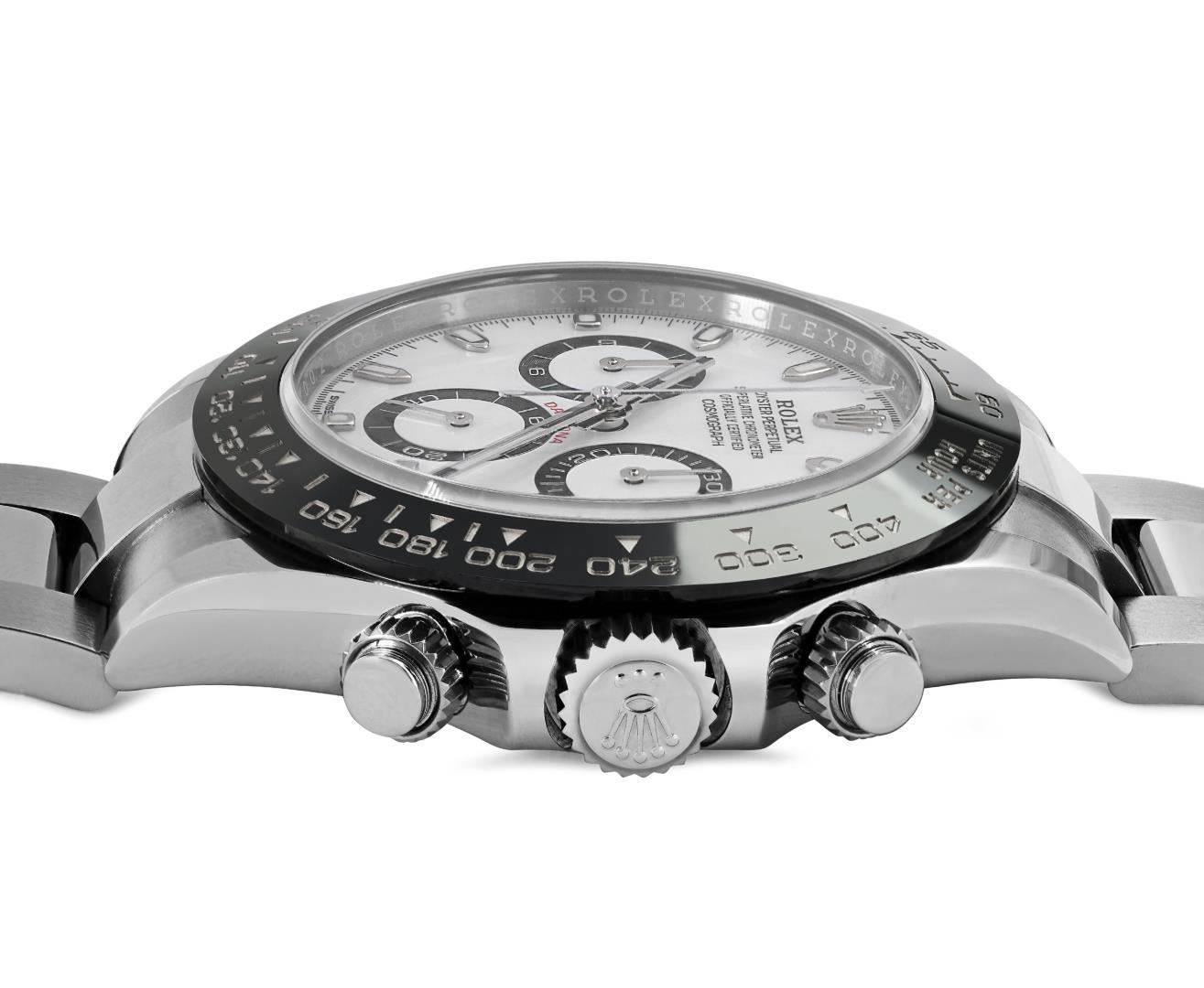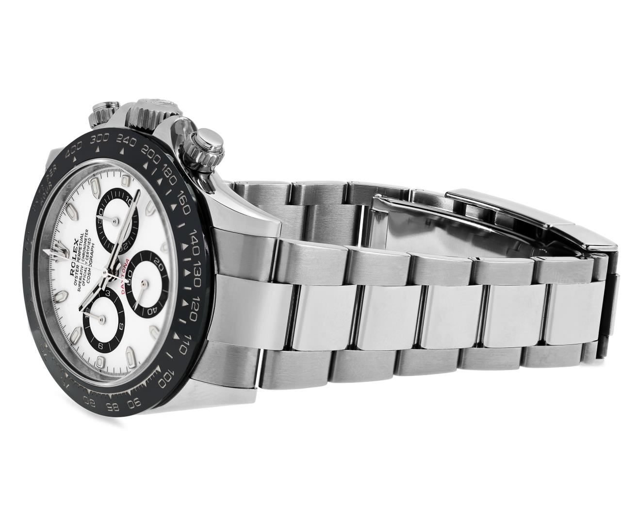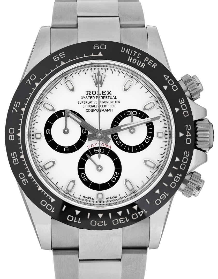 One Mens Pre Owned Stainless Steel Rolex Daytona With Date Polished, Serviced And Electronically Tested, Rolex Stainless Steel Case: 40mm, Rolex Stainless Steel Crown, Rolex Bezel: Stainless Steel Rotatable Bezel With Black Ceramic Insert. Crystal: Sapphire With Magnified Date Window. Rolex Movement: Automatic Winding Movement Caliber 4130. This watch features A Chronograph with Large Central Chronograph Second Hand, 30 Minute Counter Sub-Dial at 3 O'Clock, 12 Hour Counter Sub-Dial at 9 O'Clock. Small Second Sub-Dial at 6 O'Clock. Rolex Dial: White with White Luminous hands and Index hour markers with small seconds hand at 6 o'clock, 30-minute counter at 3 o'clock and 12-hour counter at 9 o'clock. Date Display, Model: Daytona 116500. Condition: G-6 Extra Fine. Rolex Bracelet: Stainless Steel Oyster Band. Bright Polish & Satin Finish. 7.0 Inch Length, Adjustable. Standard Clasp, With Rolex Logo. This Watch Comes With A Rolex Box And Card.