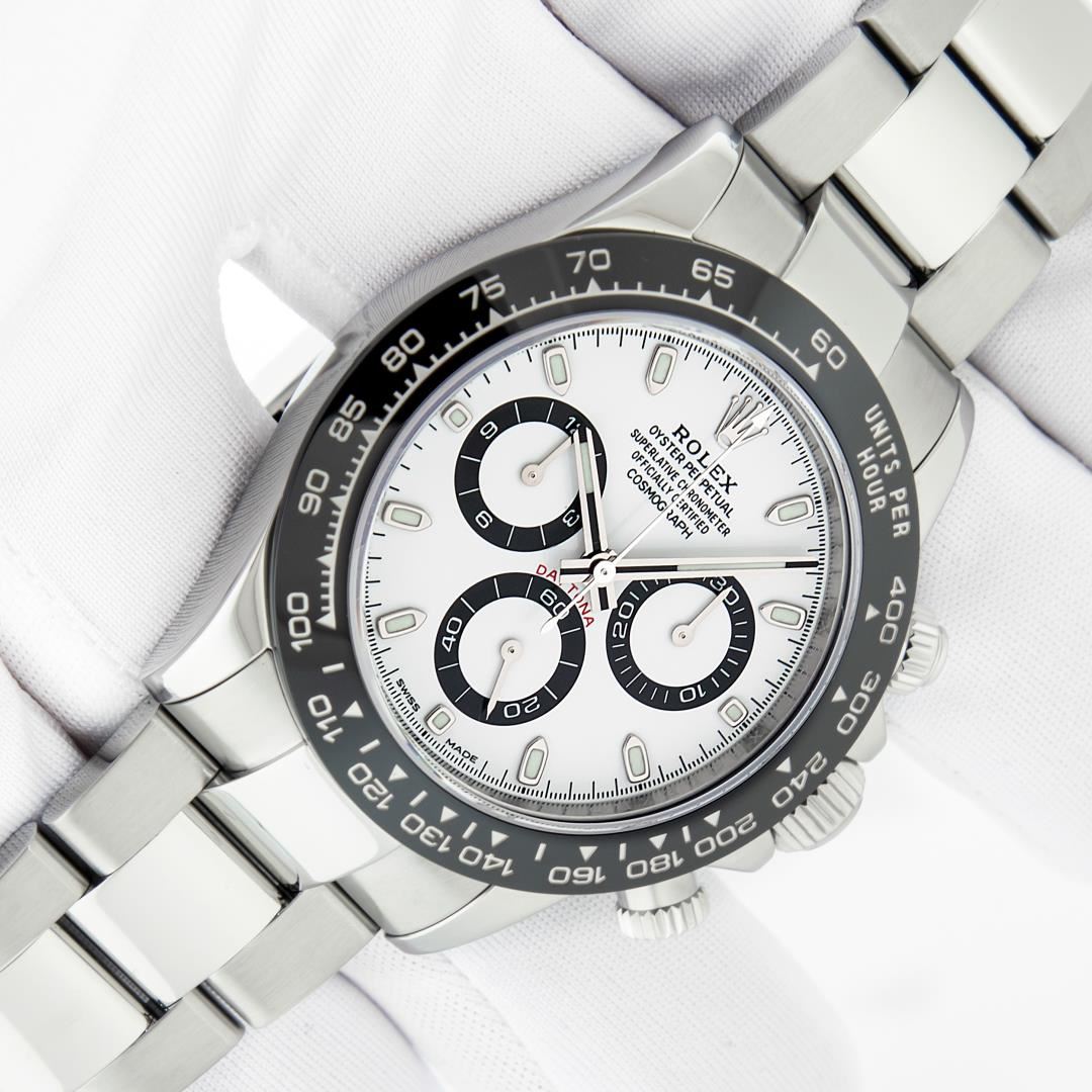 One Mens Pre Owned Rolex Stainless Steel Ceramic Daytona Polished Bright with Satin Finish, This Watch Has Been Serviced & Electronically Tested, Rolex Stainless Steel Case: 40mm, Rolex Bezel: Stainless Steel Bezel With Black Ceramic Insert. Rolex Crystal: Sapphire. Rolex Hands: Daytona Hands. Rolex Movement: Automatic Movement 4130. Rolex Dial: White Daytona Dial. Functions: Time With Running Seconds, 30 Minute Chronograph, 12 Hour Chronograph. Model: 116500 Ceramic Daytona. Condition: G-6 Extra Fine. Rolex Bracelet: Stainless Steel Oyster Band. Bright Polish & Satin Finish. 7.00 Inch Length, Adjustable. Flip Lock Clasp with Rolex Logo. This Watch Has Been Serviced Time Tested And Is In Excellent Condition It Is Free Of All Scratches And Dents. This Watch Comes With A Rolex Box.