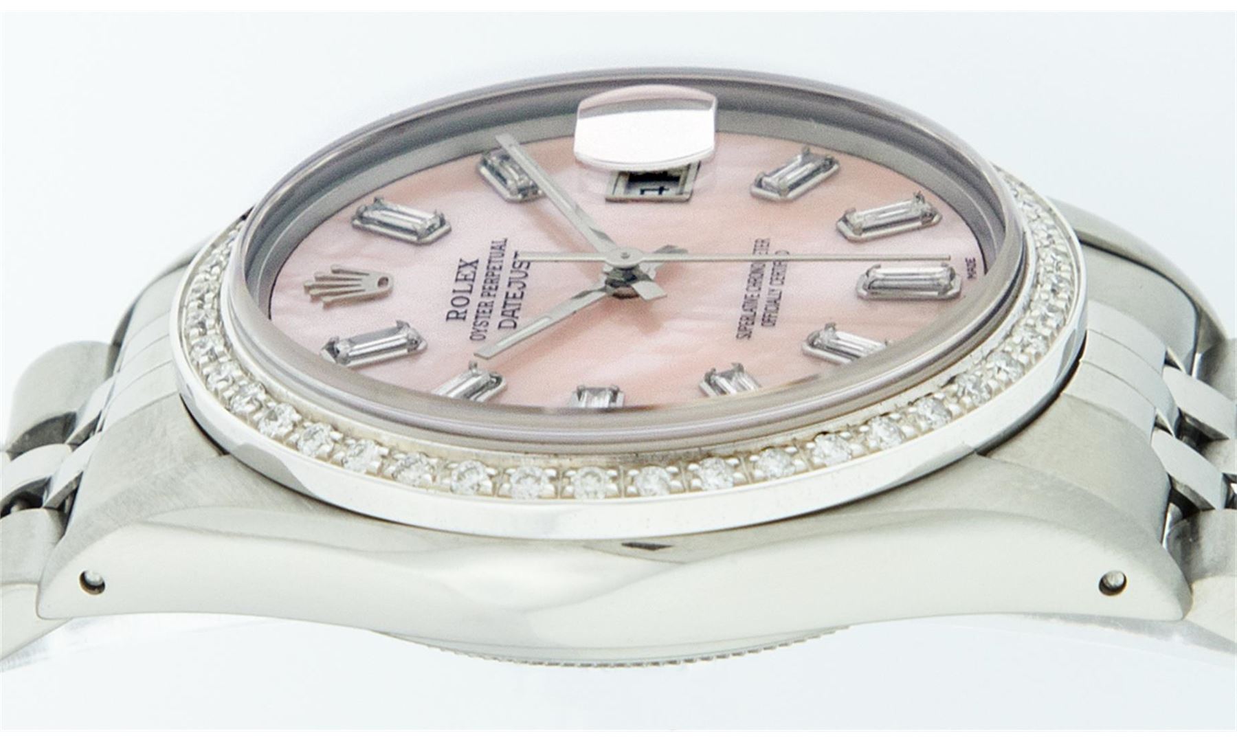 One Gents Rolex Datejust Polished, Serviced & Electronically Tested, Stainless Steel Case:36mm, Stainless Steel Crown, Custom Bezel: 18K White Gold Beadset Diamond Bezel, Diamond Count: 44 Diamonds, Total Weight 1.00 Carat, Clarity: SI-VS, Color: G to H. Custom Crystal: Synthetic Sapphire Cyclops Lens. Movement: Automatic Winding Movement Caliber 3035. Custom Dial: Pink MOP Baguette Diamond Hour Markers, Diamond Count: 10 Diamond Baguette. G To H In Color, Clarity: SI-VS. Date Window: 3 O'Clock Position Date Display, Quickset, Model: Datejust. Condition: G-6 Extra Fine. Bracelet: Stainless Steel Jubilee. Bright Polish & Satin Finish. 7.0 Inch Length, Adjustable. Standard Clasp, With Rolex Logo. Comes with 6 month warranty.