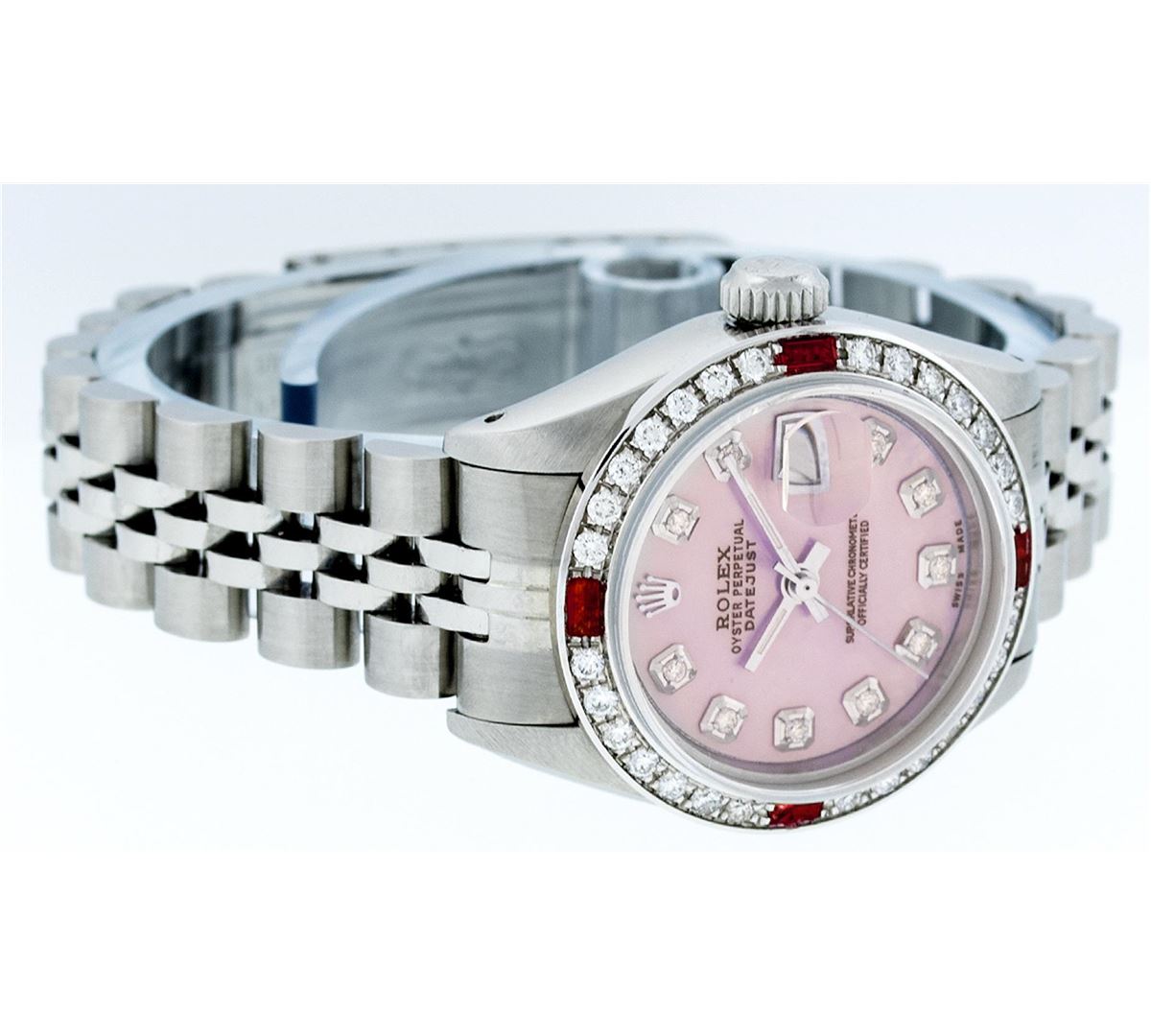 One Ladies Rolex Datejust Polished Bright with Satin Finish, Serviced & Electronically Tested, Stainless Steel Case:26mm, Stainless Steel Crown, Custom Bezel: 18K White Gold Ruby Beadset Diamond Bezel, Diamond + Gem Count: 28 Diamonds + 4 Rubies Total Weight .70 Carat, Clarity: SI-VS, Color: G to H. Custom Crystal: Synthetic Sapphire Cyclops Lens. Movement: Automatic Winding Movement Caliber 2030. Custom Dial: Refinished Pink Mother Of Pearl Diamond Dial, Diamond Count: 10 Diamonds, Clarity: SI-VS, G to H. Date Window: 3 O'Clock Position Date Display, Model: Datejust. Condition: G-6 Extra Fine. Bracelet: Stainless Steel Jubilee. Bright Polish & Satin Finish. 5.5 Inch Length, Adjustable. Standard Clasp, With Rolex Logo. Comes with a 6 month warranty card.