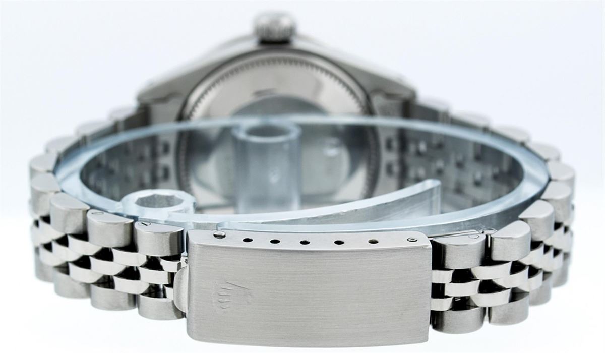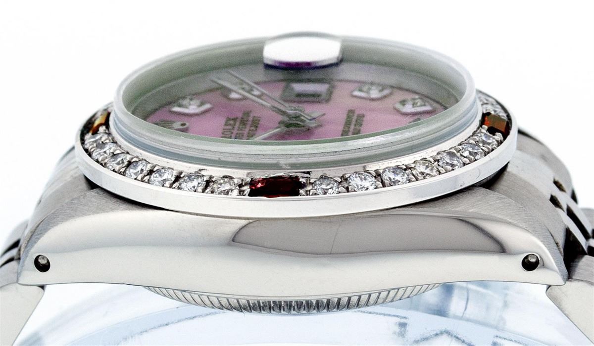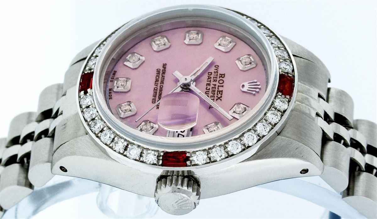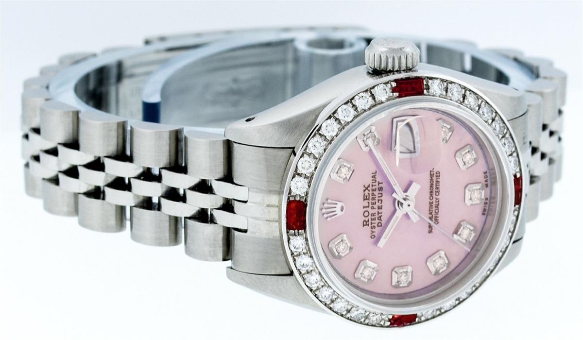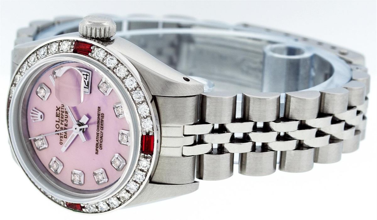 One Ladies Rolex Datejust Polished Bright with Satin Finish, Serviced & Electronically Tested, Stainless Steel Case:26mm, Stainless Steel Crown, Custom Bezel: 18K White Gold Ruby Beadset Diamond Bezel, Diamond + Gem Count: 28 Diamonds + 4 Rubies Total Weight .70 Carat, Clarity: SI-VS, Color: G to H. Custom Crystal: Synthetic Sapphire Cyclops Lens. Movement: Automatic Winding Movement Caliber 2030. Custom Dial: Refinished Pink Mother Of Pearl Diamond Dial, Diamond Count: 10 Diamonds, Clarity: SI-VS, G to H. Date Window: 3 O'Clock Position Date Display, Model: Datejust. Condition: G-6 Extra Fine. Bracelet: Stainless Steel Jubilee. Bright Polish & Satin Finish. 5.5 Inch Length, Adjustable. Standard Clasp, With Rolex Logo. Comes with a 6 month warranty card.