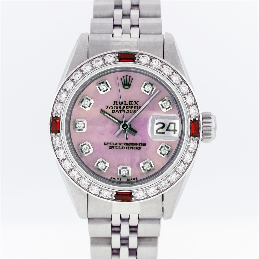 One Ladies Rolex Datejust Polished Bright with Satin Finish, Serviced & Electronically Tested, Stainless Steel Case:26mm, Stainless Steel Crown, Custom Bezel: 18K White Gold Ruby Beadset Diamond Bezel, Diamond + Gem Count: 28 Diamonds + 4 Rubies Total Weight .70 Carat, Clarity: SI-VS, Color: G to H. Custom Crystal: Synthetic Sapphire Cyclops Lens. Movement: Automatic Winding Movement Caliber 2030. Custom Dial: Refinished Pink Mother Of Pearl Diamond Dial, Diamond Count: 10 Diamonds, Clarity: SI-VS, G to H. Date Window: 3 O'Clock Position Date Display, Model: Datejust. Condition: G-6 Extra Fine. Bracelet: Stainless Steel Jubilee. Bright Polish & Satin Finish. 5.5 Inch Length, Adjustable. Standard Clasp, With Rolex Logo. Comes with a 6 month warranty card.