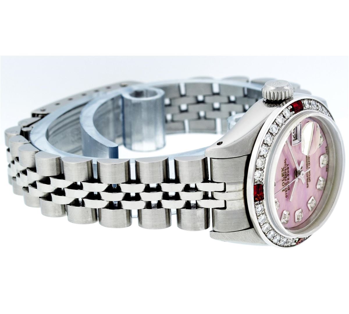 One Ladies Rolex Datejust Polished Bright with Satin Finish, Serviced & Electronically Tested, Stainless Steel Case:26mm, Stainless Steel Crown, Custom Bezel: 18K White Gold Ruby Beadset Diamond Bezel, Diamond + Gem Count: 28 Diamonds + 4 Rubies Total Weight .70 Carat, Clarity: SI-VS, Color: G to H. Custom Crystal: Synthetic Sapphire Cyclops Lens. Movement: Automatic Winding Movement Caliber 2030. Custom Dial: Refinished Pink Mother Of Pearl Diamond Dial, Diamond Count: 10 Diamonds, Clarity: SI-VS, G to H. Date Window: 3 O'Clock Position Date Display, Model: Datejust. Condition: G-6 Extra Fine. Bracelet: Stainless Steel Jubilee. Bright Polish & Satin Finish. 5.5 Inch Length, Adjustable. Standard Clasp, With Rolex Logo. Comes with a 6 month warranty card.