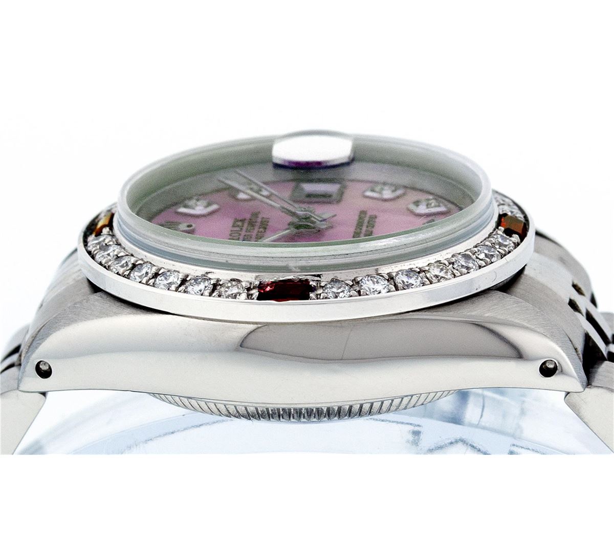 One Ladies Rolex Datejust Polished Bright with Satin Finish, Serviced & Electronically Tested, Stainless Steel Case:26mm, Stainless Steel Crown, Custom Bezel: 18K White Gold Ruby Beadset Diamond Bezel, Diamond + Gem Count: 28 Diamonds + 4 Rubies Total Weight .70 Carat, Clarity: SI-VS, Color: G to H. Custom Crystal: Synthetic Sapphire Cyclops Lens. Movement: Automatic Winding Movement Caliber 2030. Custom Dial: Refinished Pink Mother Of Pearl Diamond Dial, Diamond Count: 10 Diamonds, Clarity: SI-VS, G to H. Date Window: 3 O'Clock Position Date Display, Model: Datejust. Condition: G-6 Extra Fine. Bracelet: Stainless Steel Jubilee. Bright Polish & Satin Finish. 5.5 Inch Length, Adjustable. Standard Clasp, With Rolex Logo. Comes with a 6 month warranty card.