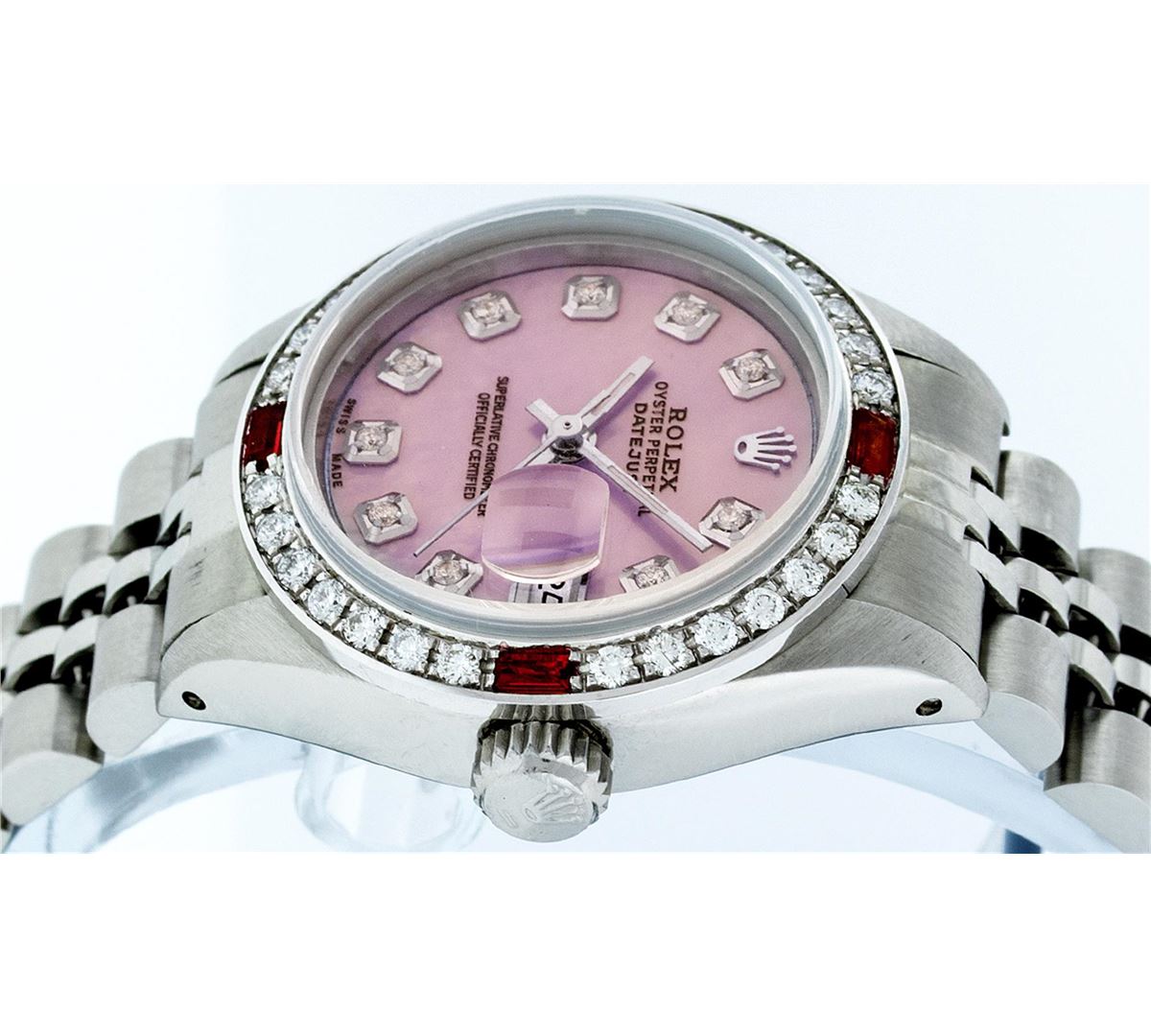One Ladies Rolex Datejust Polished Bright with Satin Finish, Serviced & Electronically Tested, Stainless Steel Case:26mm, Stainless Steel Crown, Custom Bezel: 18K White Gold Ruby Beadset Diamond Bezel, Diamond + Gem Count: 28 Diamonds + 4 Rubies Total Weight .70 Carat, Clarity: SI-VS, Color: G to H. Custom Crystal: Synthetic Sapphire Cyclops Lens. Movement: Automatic Winding Movement Caliber 2030. Custom Dial: Refinished Pink Mother Of Pearl Diamond Dial, Diamond Count: 10 Diamonds, Clarity: SI-VS, G to H. Date Window: 3 O'Clock Position Date Display, Model: Datejust. Condition: G-6 Extra Fine. Bracelet: Stainless Steel Jubilee. Bright Polish & Satin Finish. 5.5 Inch Length, Adjustable. Standard Clasp, With Rolex Logo. Comes with a 6 month warranty card.