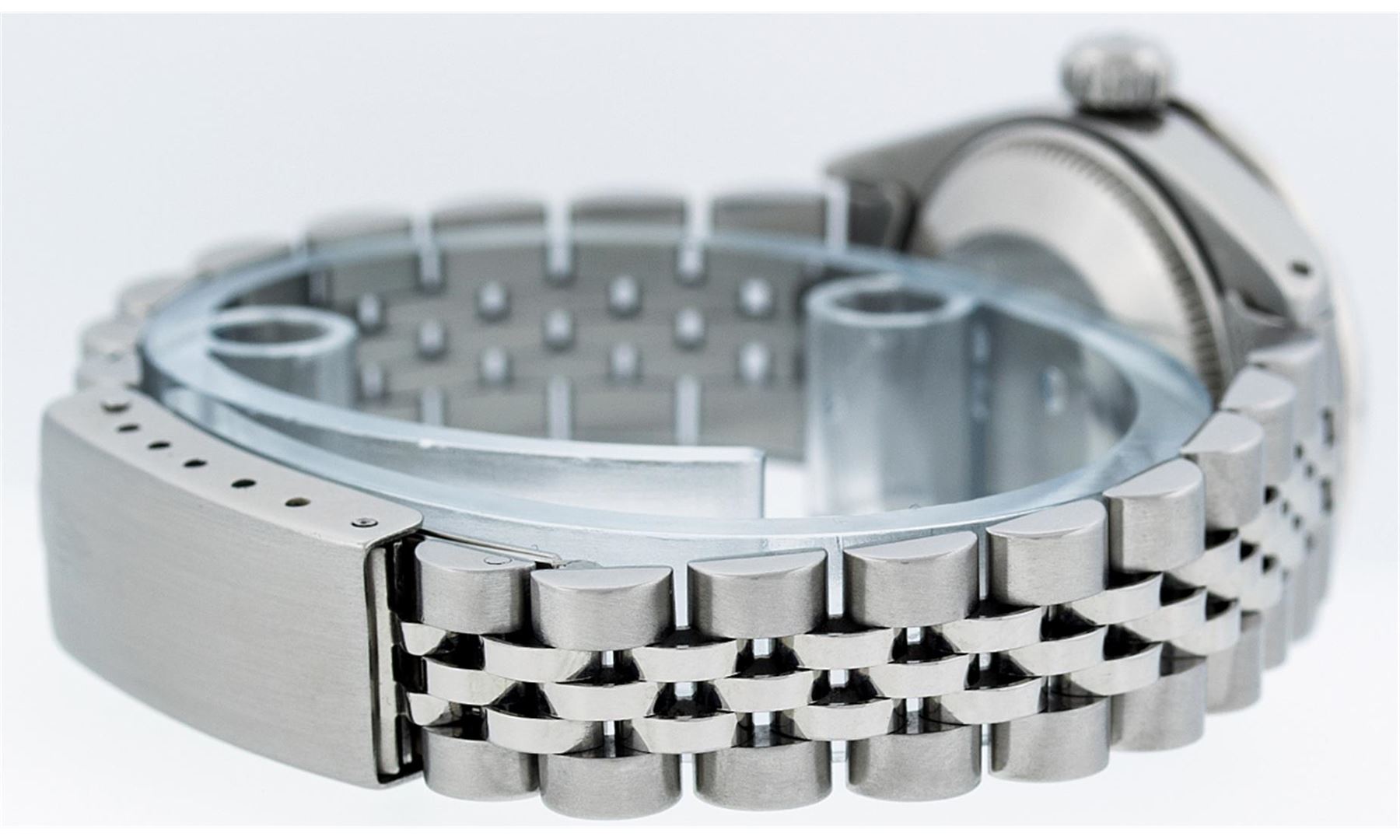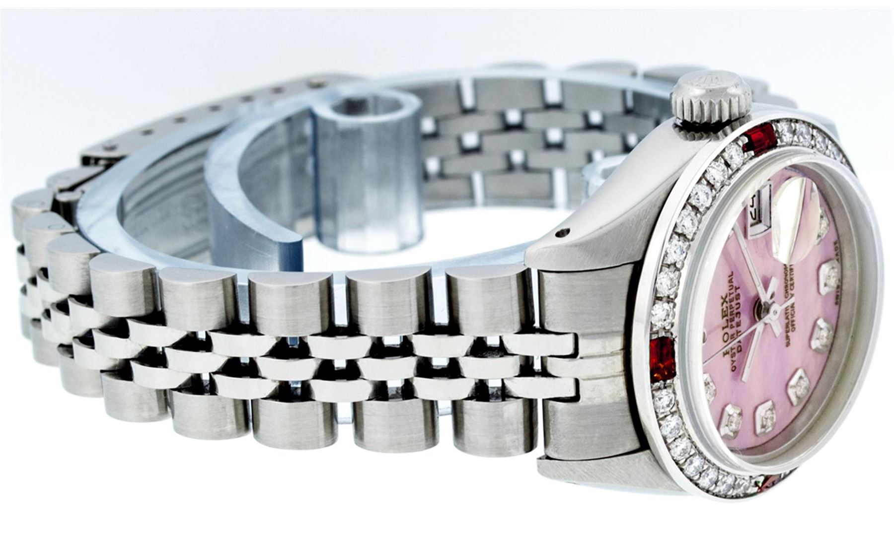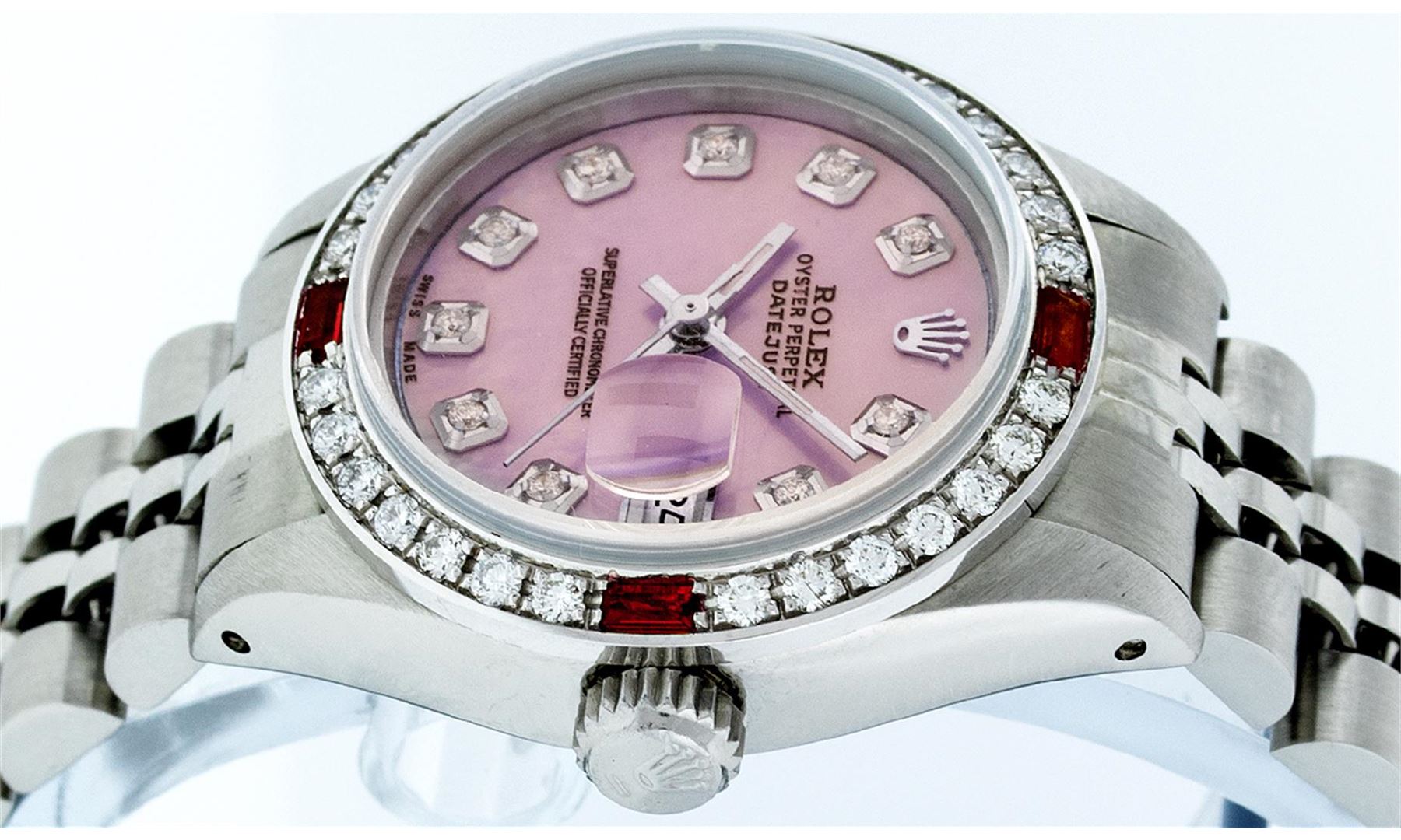 One Ladies Rolex Datejust Polished Bright with Satin Finish, Serviced & Electronically Tested, Stainless Steel Case:26mm, Stainless Steel Crown, Custom Bezel: 18K White Gold Ruby Beadset Diamond Bezel, Diamond + Gem Count: 28 Diamonds + 4 Rubies Total Weight .70 Carat, Clarity: SI-VS, Color: G to H. Custom Crystal: Synthetic Sapphire Cyclops Lens. Movement: Automatic Winding Movement Caliber 2030. Custom Dial: Refinished Pink Mother Of Pearl Diamond Dial, Diamond Count: 10 Diamonds, Clarity: SI-VS, G to H. Date Window: 3 O'Clock Position Date Display, Model: Datejust. Condition: G-6 Extra Fine. Bracelet: Stainless Steel Jubilee. Bright Polish & Satin Finish. 5.5 Inch Length, Adjustable. Standard Clasp, With Rolex Logo. Comes with a 6 month warranty card.