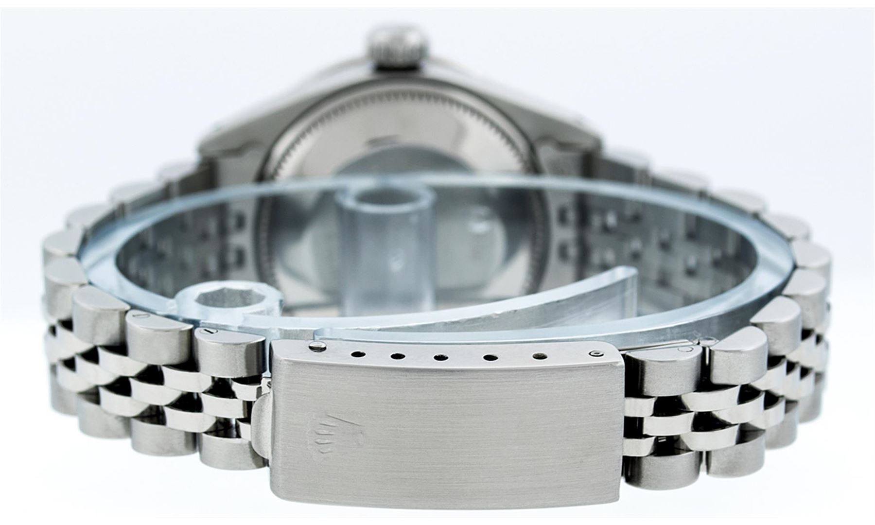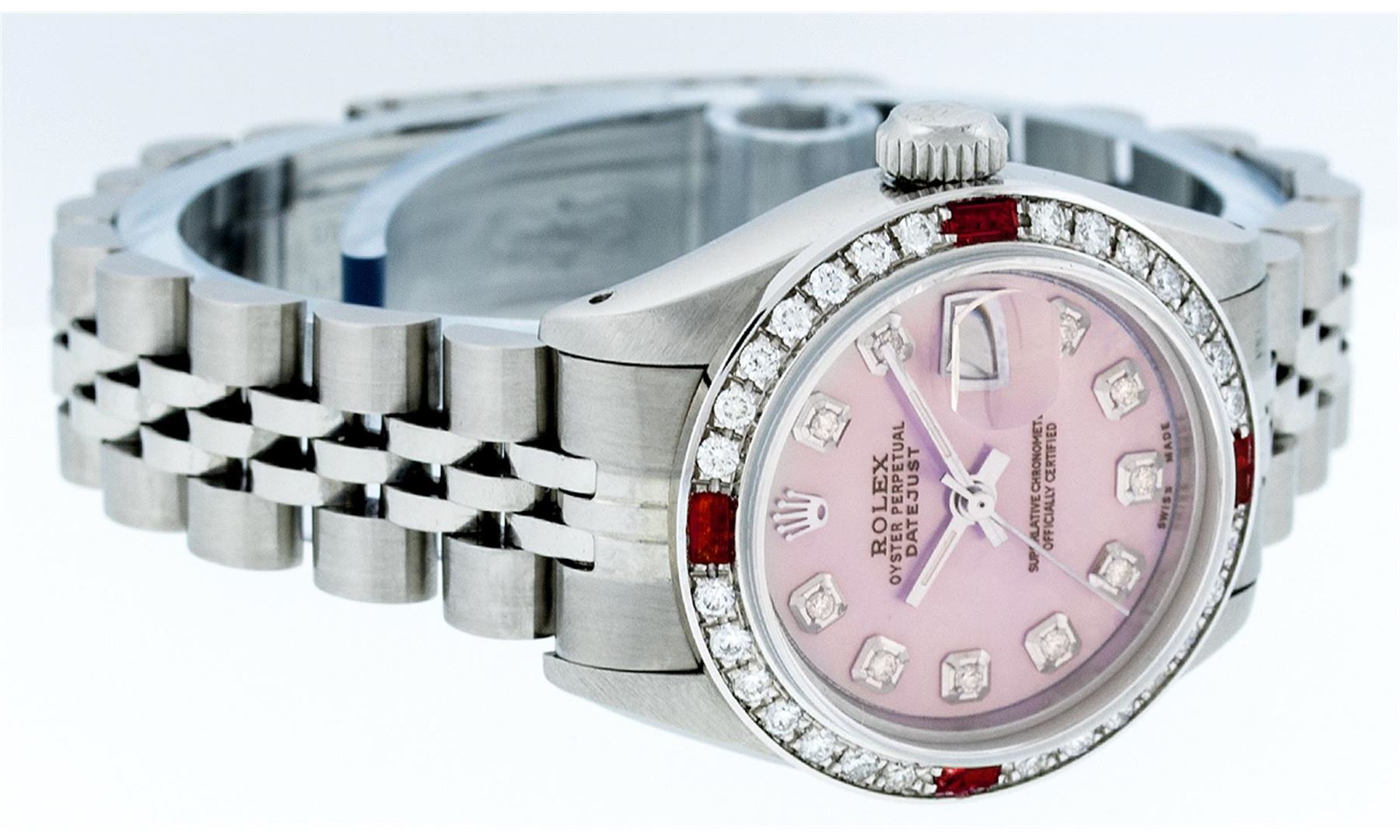 One Ladies Rolex Datejust Polished Bright with Satin Finish, Serviced & Electronically Tested, Stainless Steel Case:26mm, Stainless Steel Crown, Custom Bezel: 18K White Gold Ruby Beadset Diamond Bezel, Diamond + Gem Count: 28 Diamonds + 4 Rubies Total Weight .70 Carat, Clarity: SI-VS, Color: G to H. Custom Crystal: Synthetic Sapphire Cyclops Lens. Movement: Automatic Winding Movement Caliber 2030. Custom Dial: Refinished Pink Mother Of Pearl Diamond Dial, Diamond Count: 10 Diamonds, Clarity: SI-VS, G to H. Date Window: 3 O'Clock Position Date Display, Model: Datejust. Condition: G-6 Extra Fine. Bracelet: Stainless Steel Jubilee. Bright Polish & Satin Finish. 5.5 Inch Length, Adjustable. Standard Clasp, With Rolex Logo. Comes with a 6 month warranty card.