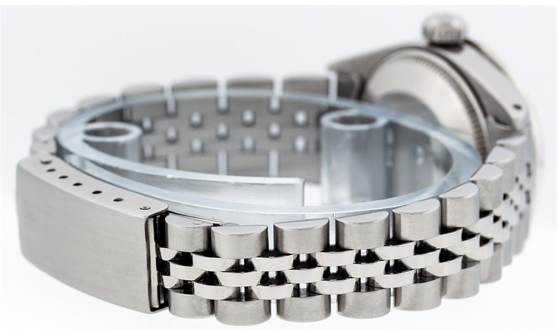 One Ladies Rolex Datejust Polished Bright with Satin Finish, Serviced & Electronically Tested, Stainless Steel Case:26mm, Stainless Steel Crown, Custom Bezel: 18K White Gold Ruby Beadset Diamond Bezel, Diamond Count: 28 Diamonds + 4 Rubies Total Weight .70 Carat, Clarity: SI-VS, Color: G to H. Custom Crystal: Synthetic Sapphire Cyclops Lens. Movement: Automatic Winding Movement Caliber 2030. Custom Dial: Purple Dial with Diamond Hour Markers. Diamond Count: 10 Diamonds In Dial, Clarity: SI-VS, Color: G to H. Date Window: 3 O'Clock Position Date Display, Model: Datejust. Condition: G-6 Extra Fine. Bracelet: Stainless Steel Jubilee Band. Bright Polish & Satin Finish. 6.0 Inch Length, Adjustable. Standard Clasp, With Rolex Logo.