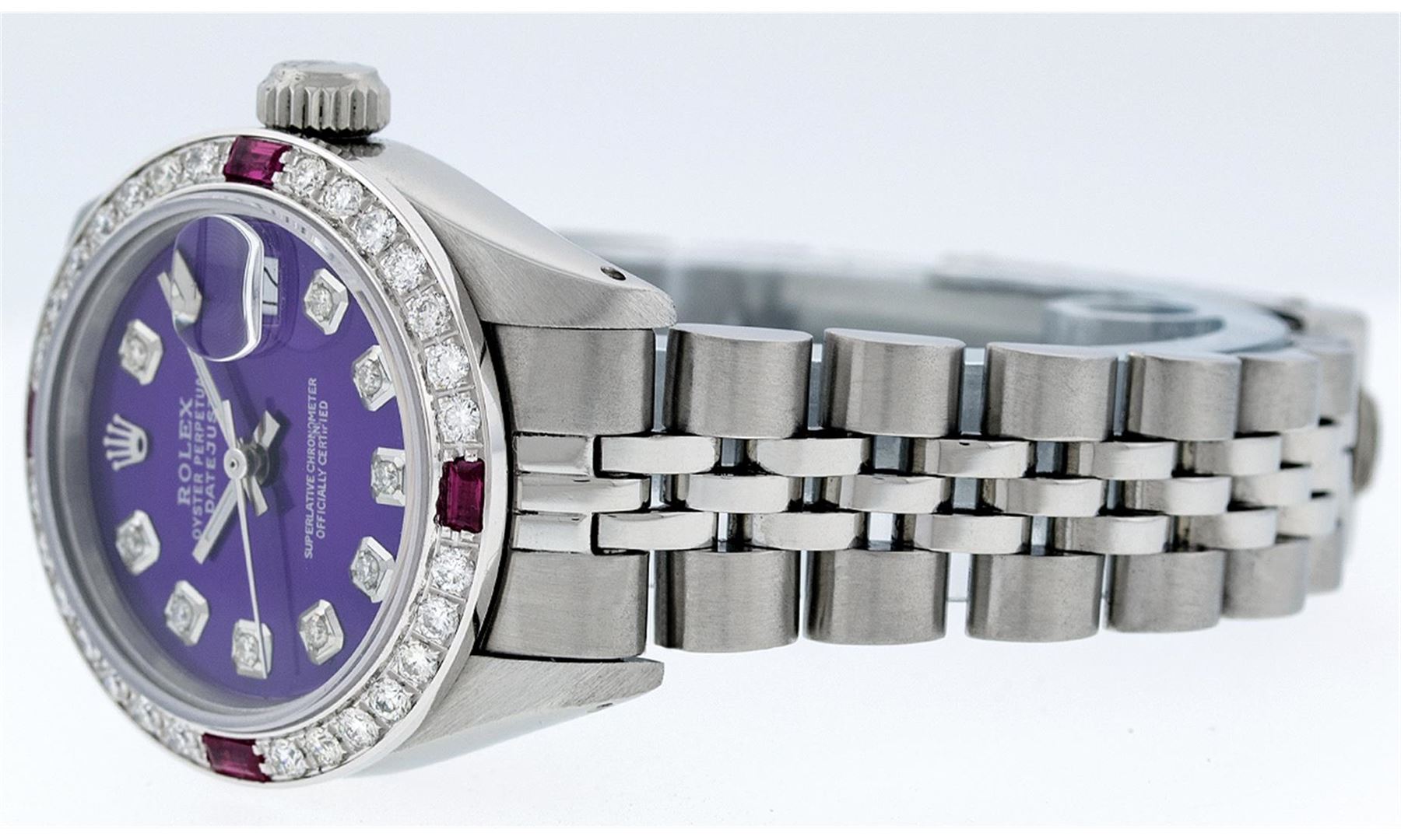 One Ladies Rolex Datejust Polished Bright with Satin Finish, Serviced & Electronically Tested, Stainless Steel Case:26mm, Stainless Steel Crown, Custom Bezel: 18K White Gold Ruby Beadset Diamond Bezel, Diamond Count: 28 Diamonds + 4 Rubies Total Weight .70 Carat, Clarity: SI-VS, Color: G to H. Custom Crystal: Synthetic Sapphire Cyclops Lens. Movement: Automatic Winding Movement Caliber 2030. Custom Dial: Purple Dial with Diamond Hour Markers. Diamond Count: 10 Diamonds In Dial, Clarity: SI-VS, Color: G to H. Date Window: 3 O'Clock Position Date Display, Model: Datejust. Condition: G-6 Extra Fine. Bracelet: Stainless Steel Jubilee Band. Bright Polish & Satin Finish. 6.0 Inch Length, Adjustable. Standard Clasp, With Rolex Logo.