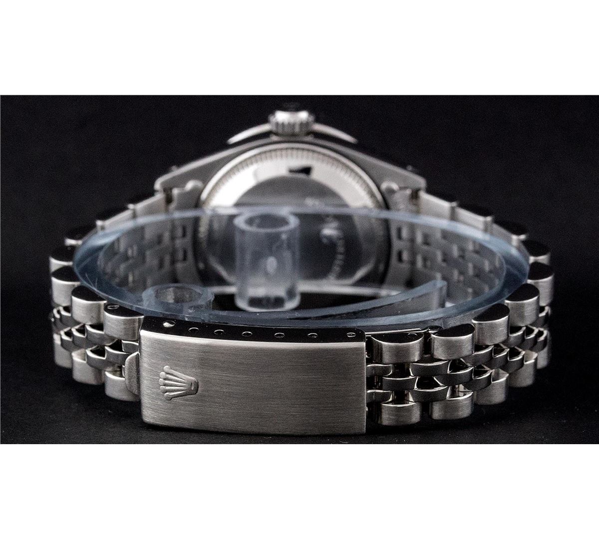 One Ladies Rolex Datejust Polished Bright with Satin Finish, Serviced & Electronically Tested, Stainless Steel Case:26mm, Stainless Steel Crown, Custom Bezel: 18K White Gold Ruby Beadset Diamond Bezel, Diamond Count: 28 Diamonds + 4 Rubies Total Weight .70 Carat, Clarity: SI-VS, Color: G to H. Custom Crystal: Synthetic Sapphire Cyclops Lens. Movement: Automatic Winding Movement Caliber 2030. Custom Dial: Purple Dial with Diamond Hour Markers. Diamond Count: 10 Diamonds In Dial, Clarity: SI-VS, Color: G to H. Date Window: 3 O'Clock Position Date Display, Non Quickset, Model: 6917 Condition: G-6 Extra Fine. Bracelet: Stainless Steel Jubilee Band. Bright Polish & Satin Finish. 5.5 Inch Length, Adjustable. Standard Clasp, With Rolex Logo.