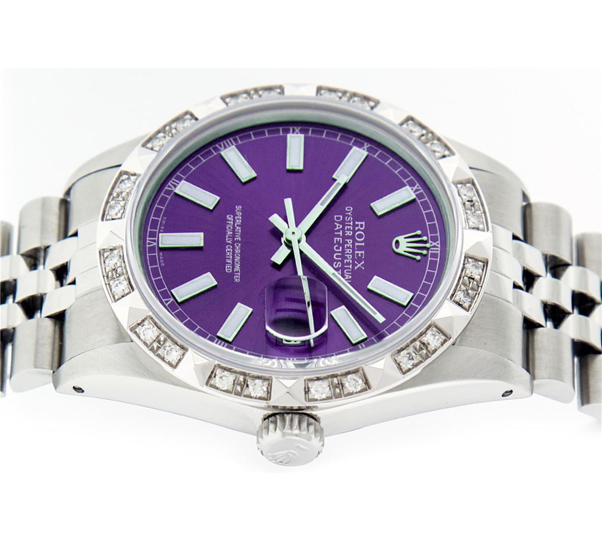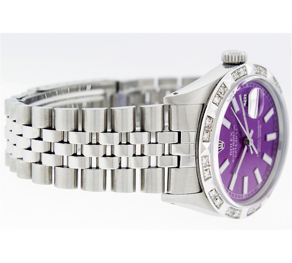 One Mens Rolex Datejust Polished Bright with Satin Finish, Serviced & Electronically Tested, Stainless Steel Case:36mm, Stainless Steel Crown, Custom Bezel: 18K White Gold Pyramid Diamond Bezel, Diamond Count: 24 Diamonds Total Weight .70 Carat, Clarity: SI-VS, Color: G to H. Custom Crystal: Synthetic Sapphire Cyclops Lens. Movement: Automatic Winding Movement Caliber 3035. Custom Dial: Purple Index Dial. Date Window: 3 O'Clock Position Date Display, Quickset, Model: Datejust, Condition: G-6 Extra Fine. Bracelet: Stainless Steel Jubilee. Bright Polish & Satin Finish. 7.0 Inch Length, Adjustable. Standard Clasp, With Rolex Logo. Comes with a 6 month warranty card.
