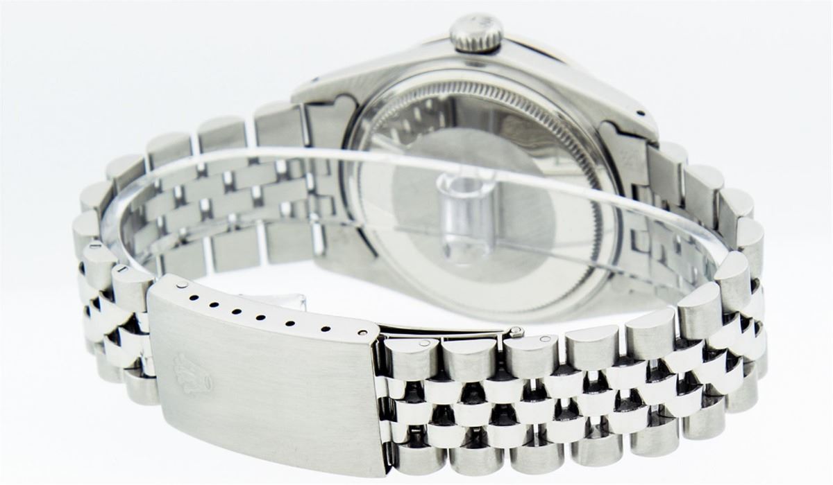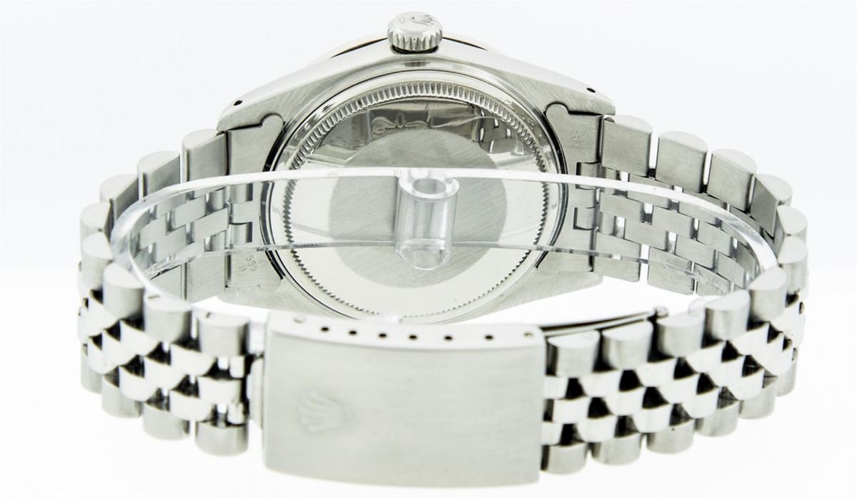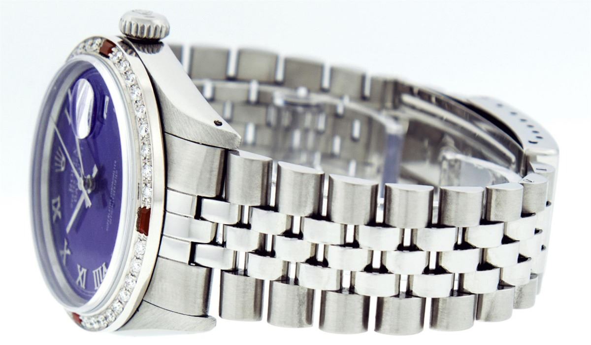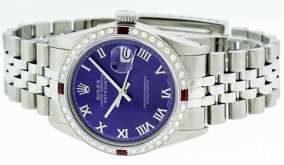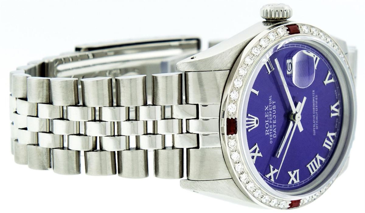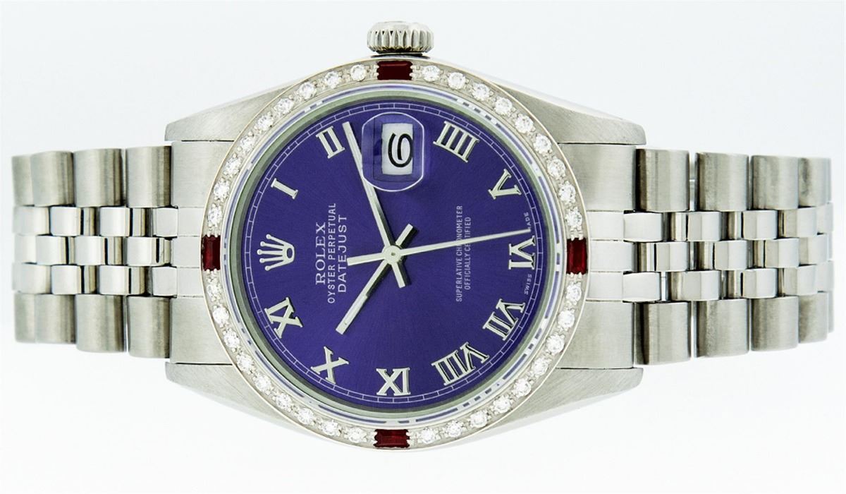 One Mens Rolex Datejust Polished Bright with Satin Finish, Serviced & Electronically Tested, Stainless Steel Case:36mm, Stainless Steel Crown, Custom Bezel: 18K White Gold Ruby Beadset Diamond Bezel, Diamond + Gem Count: 36 Diamonds + 4 Rubies. Total Weight 1.00 Carat, Clarity: Si-VS, Color: G to H. Custom Crystal: Synthetic Sapphire Cyclops Lens. Movement: Automatic Winding Movement Caliber 3035. Custom Dial: Purple Roman Dial With Square Track. Date Window: 3 O'Clock Position Date Display, Quickset, Model: Datejust. Condition: G-6 Extra Fine. Bracelet: Stainless Steel Jubilee. Bright Polish & Satin Finish. 7.0 Inch Length, Adjustable. Standard Clasp, With Rolex Logo. Comes with a 6 month warranty card.