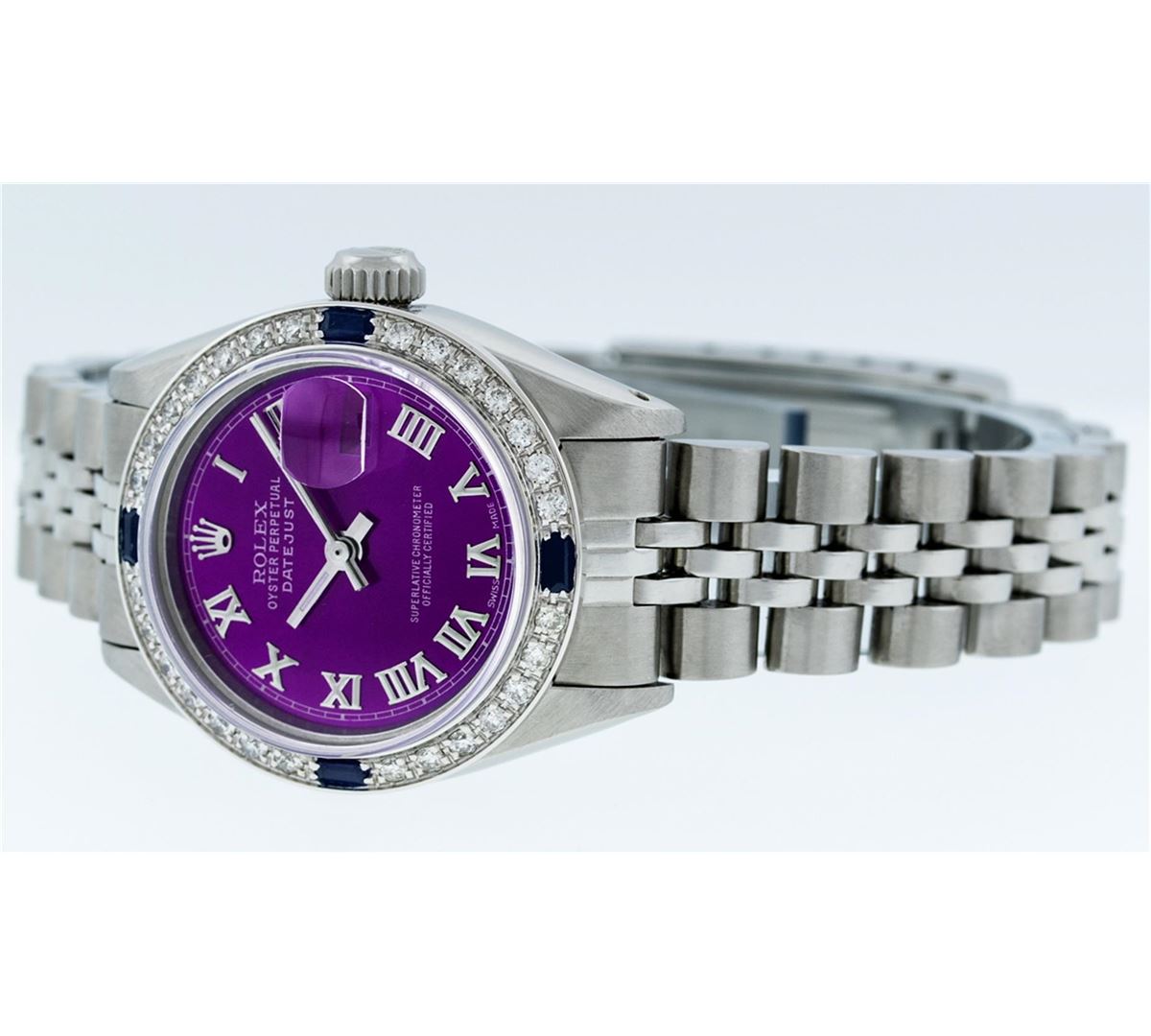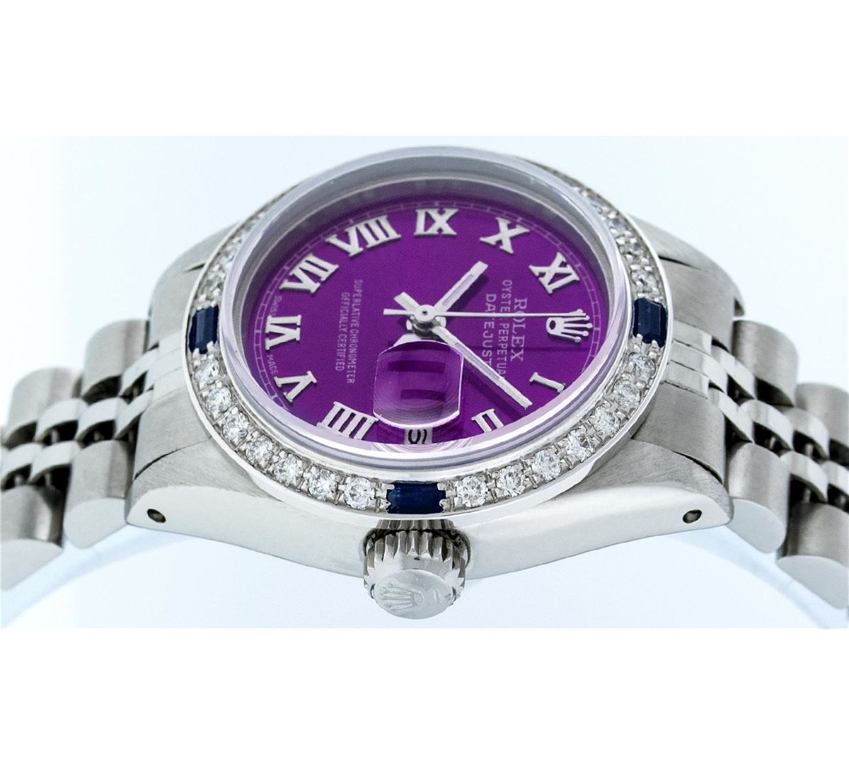 One Ladies Rolex Datejust Polished Bright with Satin Finish, Serviced & Electronically Tested, Stainless Steel Case:26mm, Stainless Steel Crown, Custom Bezel: 18K White Gold Sapphire Beadset Diamond Bezel, Diamond + Gem Count: 28 Diamonds + 4 Sapphires Total Weight .70 Carat, Clarity: SI-VS, Color: G to H. Custom Crystal: Synthetic Sapphire Cyclops Lens. Movement: Automatic Winding Movement Caliber 2030. Custom Dial: Refinished Purple Roman Dial With Square Track. Date Window: 3 O'Clock Position Date Display, Model: Datejust. Condition: G-6 Extra Fine. Bracelet: Stainless Steel Jubilee. Bright Polish & Satin Finish. 5.5 Inch Length, Adjustable. Standard Clasp, With Rolex Logo. Comes with a 6 month warranty card.