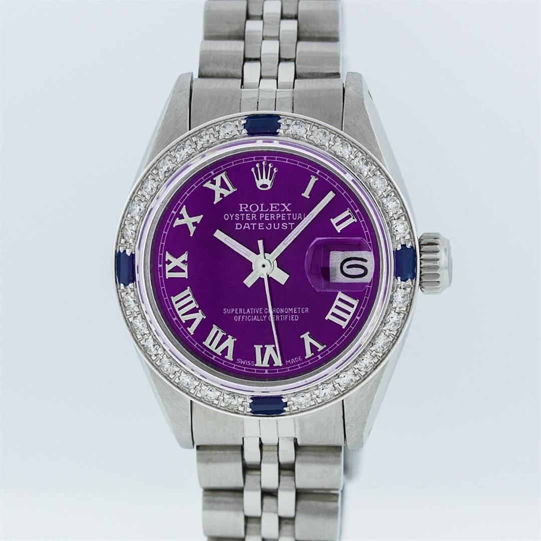 One Ladies Rolex Datejust Polished Bright with Satin Finish, Serviced & Electronically Tested, Stainless Steel Case:26mm, Stainless Steel Crown, Custom Bezel: 18K White Gold Sapphire Beadset Diamond Bezel, Diamond + Gem Count: 28 Diamonds + 4 Sapphires Total Weight .70 Carat, Clarity: SI-VS, Color: G to H. Custom Crystal: Synthetic Sapphire Cyclops Lens. Movement: Automatic Winding Movement Caliber 2030. Custom Dial: Refinished Purple Roman Dial With Square Track. Date Window: 3 O'Clock Position Date Display, Model: Datejust. Condition: G-6 Extra Fine. Bracelet: Stainless Steel Jubilee. Bright Polish & Satin Finish. 5.5 Inch Length, Adjustable. Standard Clasp, With Rolex Logo. Comes with a 6 month warranty card.