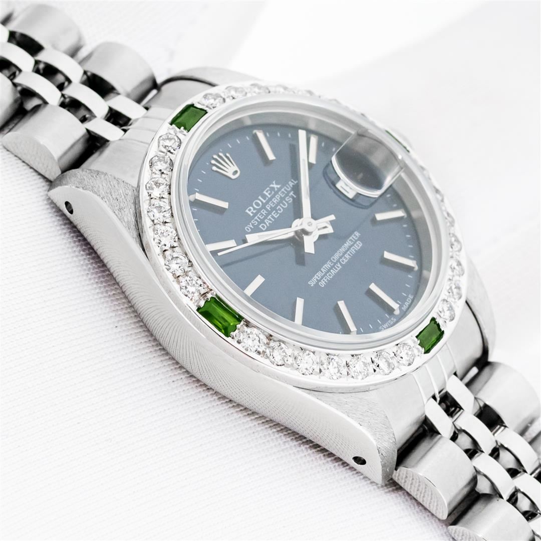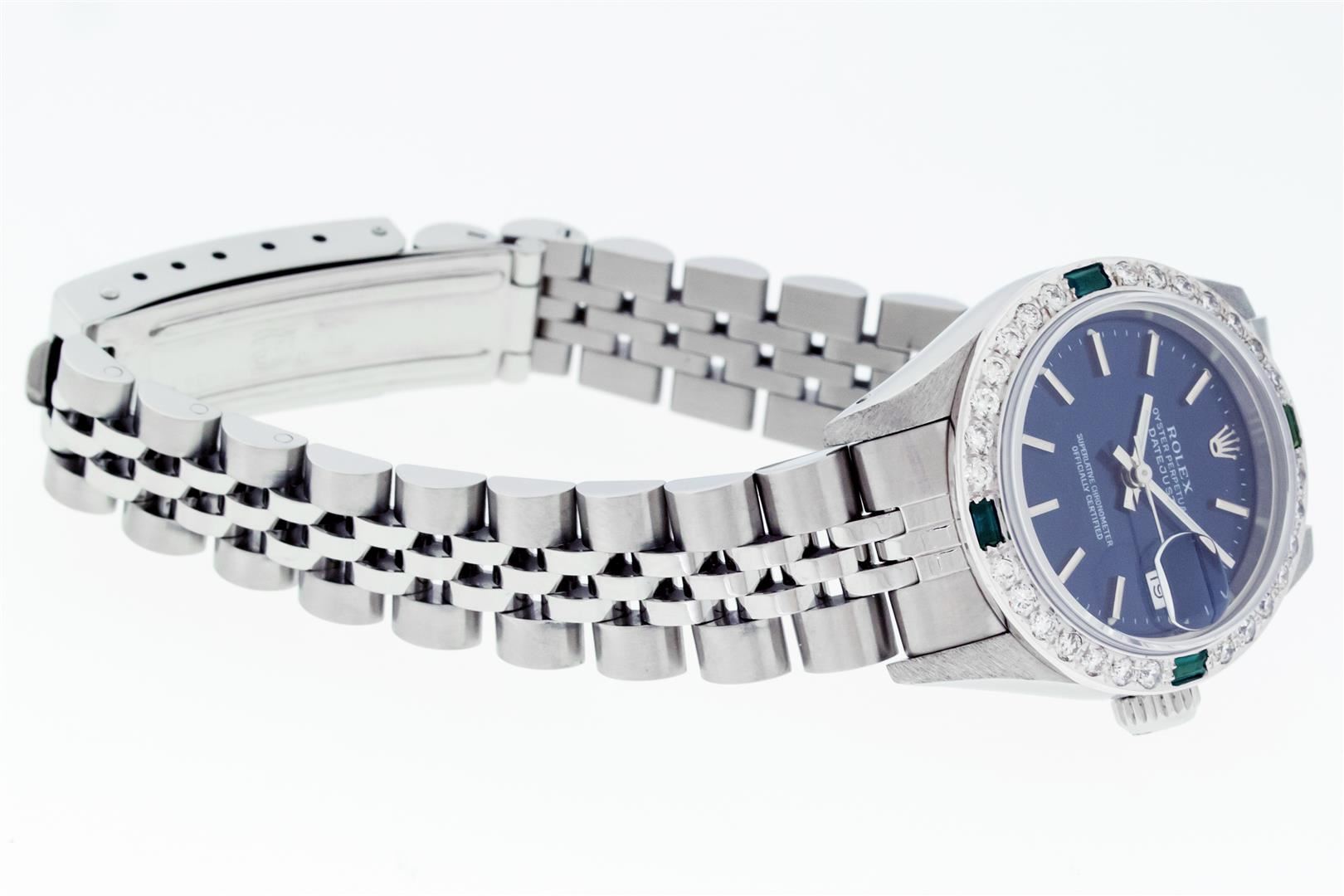 One Ladies Pre Owned Quickset Stainless Steel Rolex Datejust Polished Bright with Satin Finish Serviced & Electronically Tested, Rolex Stainless Steel Case: 26mm, Rolex Stainless Steel Crown, Custom Bezel: New White Gold Beadset + Emerald Diamond Bezel, Diamond Count: 28 Diamonds + 4 Emeralds. Custom Crystal: New Sapphire With Date Window. Custom Hands: New Luminescent Hands. Rolex Movement: Automatic Winding Movement. Rolex Dial: Blue Index Dial With Dash Track. Date Window: 3 O'Clock Position Date Display, Model: Datejust. Condition: G-6 Extra Fine. Rolex Bracelet: Stainless Steel Jubilee Band With Rolex Crown On Buckle. Bright Polish & Satin Finish. Band Length: 6.0 Inch Length, Adjustable. Standard Clasp, With Rolex Logo. This Watch Has Been Serviced Time Tested And Is In Excellent Condition It Is Free Of All Scratches And Dents.