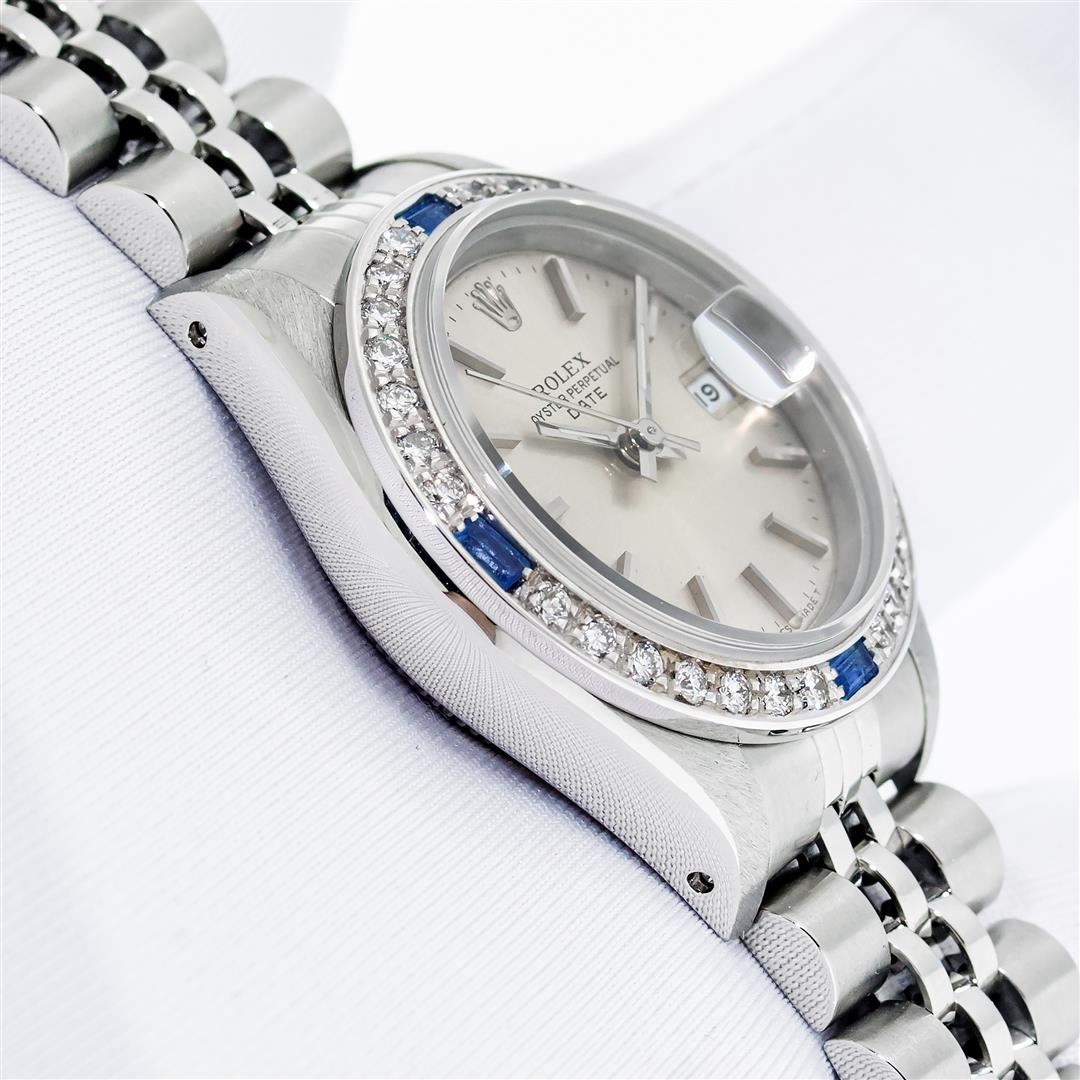 One Ladies Pre Owned Quickset Stainless Steel Rolex Date Polished Bright with Satin Finish Serviced & Electronically Tested, Rolex Stainless Steel Case: 26mm, Rolex Stainless Steel Crown, Custom Bezel: New White Gold Beadset + Sapphire Diamond Bezel, Diamond Count: 28 Diamonds + 4 Sapphires. Custom Crystal: New Sapphire With Date Window. Custom Hands: New Luminescent Hands. Rolex Movement: Automatic Winding Movement. Rolex Dial: Silver Index Dial With Dash Track And Lumi Dot. Date Window: 3 O'Clock Position Date Display, Model: Datejust. Condition: G-6 Extra Fine. Rolex Bracelet: Stainless Steel Jubilee Band With Rolex Crown On Buckle. Bright Polish & Satin Finish. Band Length: 6.0 Inch Length, Adjustable. Standard Clasp, With Rolex Logo. This Watch Has Been Serviced Time Tested And Is In Excellent Condition It Is Free Of All Scratches And Dents.