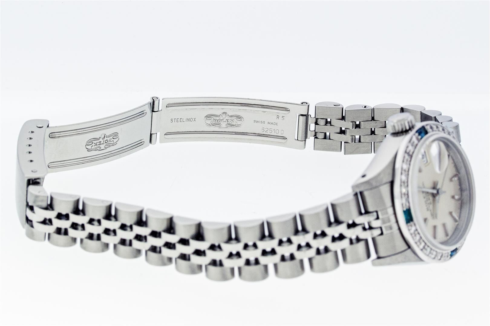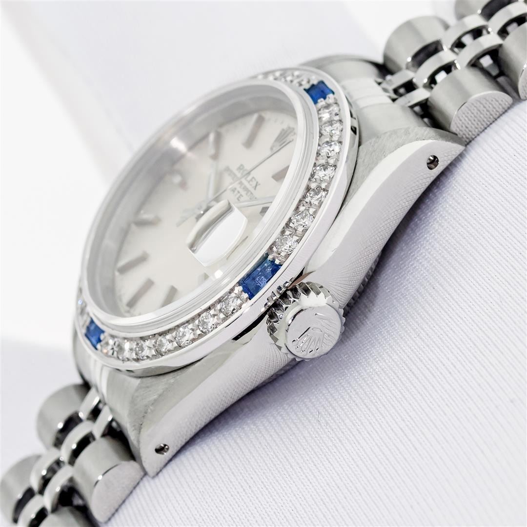 One Ladies Pre Owned Quickset Stainless Steel Rolex Date Polished Bright with Satin Finish Serviced & Electronically Tested, Rolex Stainless Steel Case: 26mm, Rolex Stainless Steel Crown, Custom Bezel: New White Gold Beadset + Sapphire Diamond Bezel, Diamond Count: 28 Diamonds + 4 Sapphires. Custom Crystal: New Sapphire With Date Window. Custom Hands: New Luminescent Hands. Rolex Movement: Automatic Winding Movement. Rolex Dial: Silver Index Dial With Dash Track And Lumi Dot. Date Window: 3 O'Clock Position Date Display, Model: Datejust. Condition: G-6 Extra Fine. Rolex Bracelet: Stainless Steel Jubilee Band With Rolex Crown On Buckle. Bright Polish & Satin Finish. Band Length: 6.0 Inch Length, Adjustable. Standard Clasp, With Rolex Logo. This Watch Has Been Serviced Time Tested And Is In Excellent Condition It Is Free Of All Scratches And Dents.