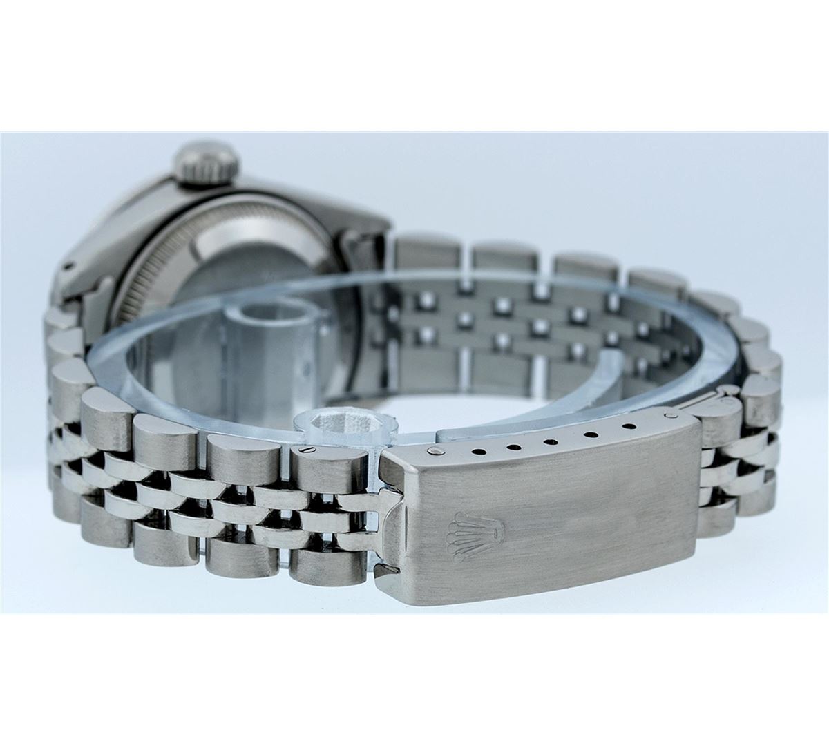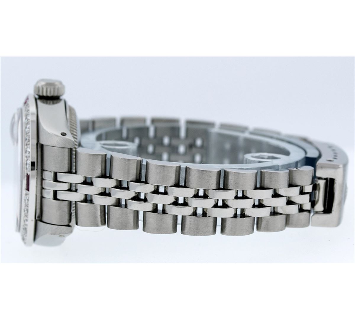 Ladies Rolex Datejust Polished Bright with Satin Finish, Serviced & Electronically Tested, Stainless Steel Case:26mm, Stainless Steel Crown, Custom Bezel: 18K White Gold Ruby Beadset Diamond Bezel, Diamond + Gem Count: 28 Diamonds + 4 Rubies Total Weight .70 Carat, Clarity: SI-VS, Color: G to H. Custom Crystal: Synthetic Sapphire Cyclops Lens. Movement: Automatic Winding Movement Caliber 2030. Custom Dial: Refinished Red Diamond Dial. Diamond Count: 10 Diamonds In Dial, Color: G To H, VS SI1. Date Window: 3 O'Clock Position Date Display, Model: Datejust Condition: G-6 Extra Fine. Bracelet: Stainless Steel Jubilee. Bright Polish & Satin Finish. 5.5 Inch Length, Adjustable. Standard Clasp, With Rolex Logo.