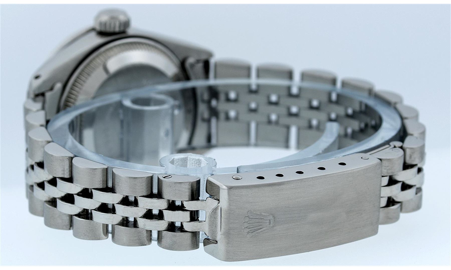 Ladies Rolex Datejust Polished Bright with Satin Finish, Serviced & Electronically Tested, Stainless Steel Case:26mm, Stainless Steel Crown, Custom Bezel: 18K White Gold Ruby Beadset Diamond Bezel, Diamond + Gem Count: 28 Diamonds + 4 Rubies Total Weight .70 Carat, Clarity: SI-VS, Color: G to H. Custom Crystal: Synthetic Sapphire Cyclops Lens. Movement: Automatic Winding Movement Caliber 2030. Custom Dial: Refinished Red Diamond Dial. Diamond Count: 10 Diamonds In Dial, Color: G To H, VS SI1. Date Window: 3 O'Clock Position Date Display, Model: Datejust Condition: G-6 Extra Fine. Bracelet: Stainless Steel Jubilee. Bright Polish & Satin Finish. 5.5 Inch Length, Adjustable. Standard Clasp, With Rolex Logo.