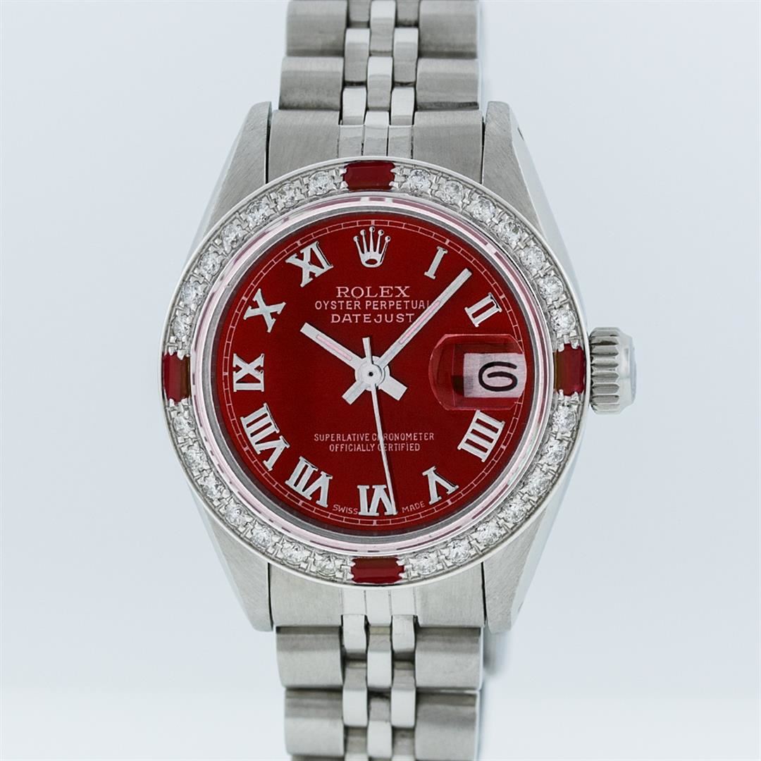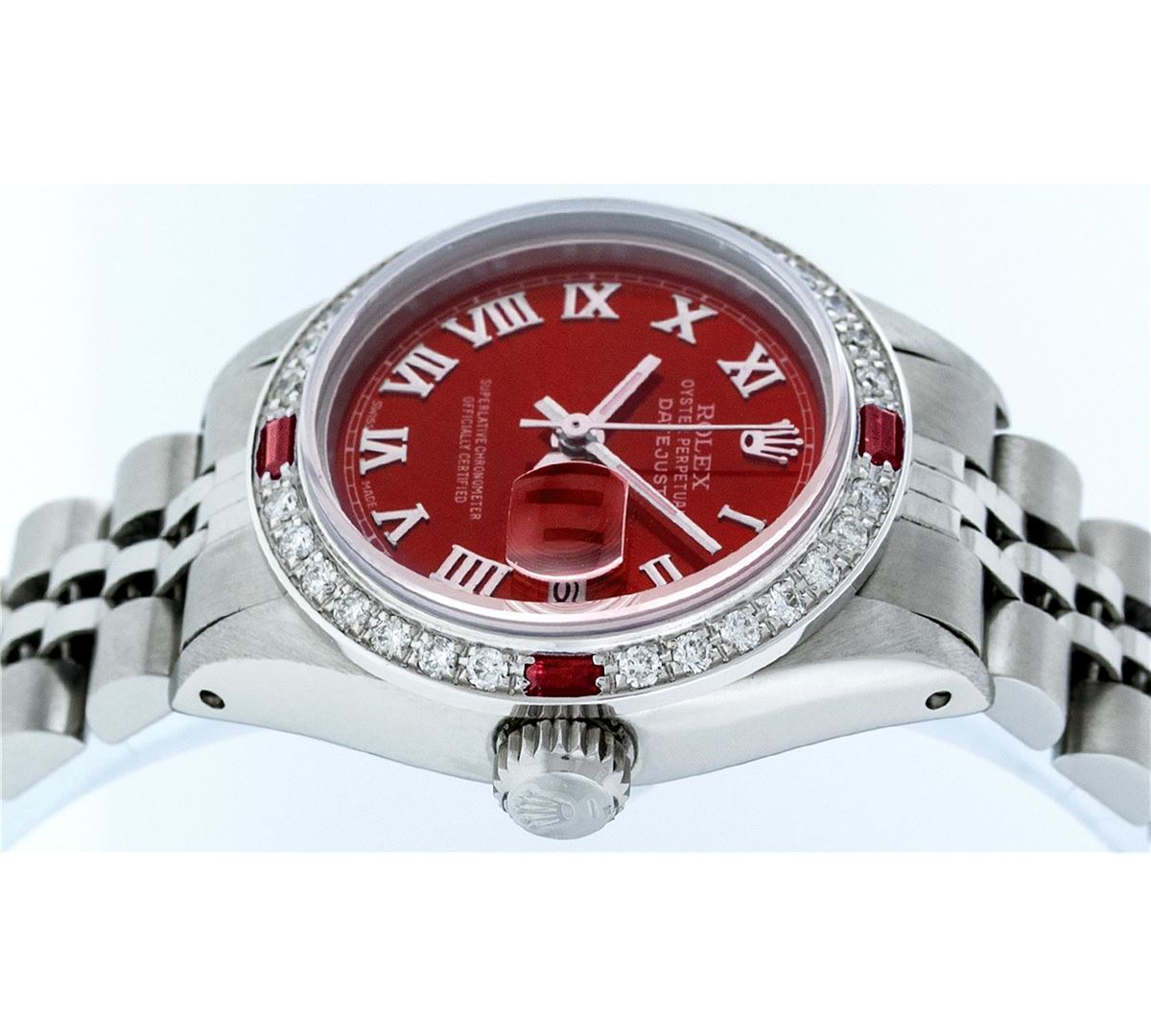 One Ladies Rolex Datejust Polished Bright with Satin Finish, Serviced & Electronically Tested, Stainless Steel Case:26mm, Stainless Steel Crown, Custom Bezel: 18K White Gold Ruby Beadset Diamond Bezel, Diamond + Gem Count: 28 Diamonds + 4 Rubies Total Weight .70 Carat, Clarity: SI-VS, Color: G to H. Custom Crystal: Synthetic Sapphire Cyclops Lens. Movement: Automatic Winding Movement Caliber 2030. Custom Dial: Refinished Red Roman Dial With Square Track.. Date Window: 3 O'Clock Position Date Display, Model: Datejust. Condition: G-6 Extra Fine. Bracelet: Stainless Steel Jubilee. Bright Polish & Satin Finish. 5.5 Inch Length, Adjustable. Standard Clasp, With Rolex Logo. Comes with a 6 month warranty card.