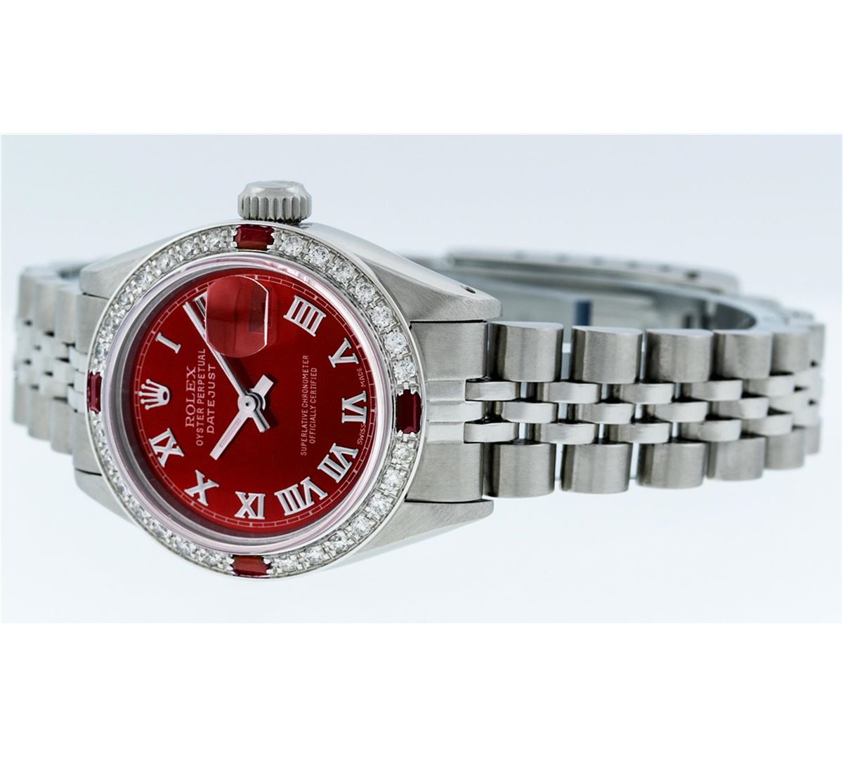 One Ladies Rolex Datejust Polished Bright with Satin Finish, Serviced & Electronically Tested, Stainless Steel Case:26mm, Stainless Steel Crown, Custom Bezel: 18K White Gold Ruby Beadset Diamond Bezel, Diamond + Gem Count: 28 Diamonds + 4 Rubies Total Weight .70 Carat, Clarity: SI-VS, Color: G to H. Custom Crystal: Synthetic Sapphire Cyclops Lens. Movement: Automatic Winding Movement Caliber 2030. Custom Dial: Refinished Red Roman Dial With Square Track.. Date Window: 3 O'Clock Position Date Display, Model: Datejust. Condition: G-6 Extra Fine. Bracelet: Stainless Steel Jubilee. Bright Polish & Satin Finish. 5.5 Inch Length, Adjustable. Standard Clasp, With Rolex Logo. Comes with a 6 month warranty card.