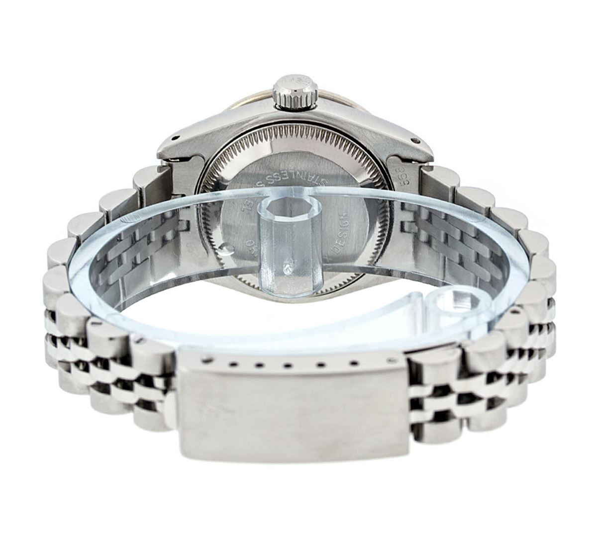 One Ladies Rolex Datejust Polished Bright with Satin Finish, Serviced & Electronically Tested, Stainless Steel Case:26mm, Stainless Steel Crown, Diamond Lugs: 16 Diamonds On Lugs, Clarity: SI-VS, Color: G to H. Custom Bezel: 18K White Gold Ruby Beadset Bezel, Diamond Count: 28 Diamonds + 4 Rubies, Total Weight 1.00 Carat, Clarity: SI-VS, Color: G to H. Custom Crystal: Synthetic Sapphire Cyclops Lens. Movement: Automatic Winding Movement Caliber 2030. Custom Dial: Refinished Red With String Diamond Dial, 43 Diamonds in Dial G To H In Color, Clarity: VVS. Date Window: 3 O'Clock Position Date Display, Model: Datejust Condition: G-6 Extra Fine. Bracelet: Stainless Steel Jubilee. Bright Polish & Satin Finish. 5.5 Inch Length, Adjustable. Standard Clasp, With Rolex Logo. Comes with a 6 month warranty card.