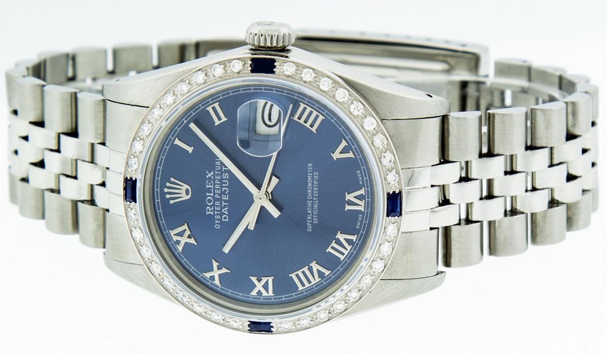 One Gents Rolex Datejust Polished, Serviced & Electronically Tested, Stainless Steel Case:36mm, Stainless Steel Crown, Custom Bezel: 18K White Gold Sapphire Beadset Diamond Bezel, Diamond + Gem Count: 36 Diamonds + 4 Sapphires Total Weight 1.00 Carat, Clarity: SI-VS, Color: G to H. Custom Crystal: Synthetic Sapphire Cyclops Lens. Movement: Automatic Winding Movement Caliber 3035. Custom Dial: Blue With Roman Hour Markers & Square Track. Date Window: 3 O'Clock Position Date Display, Quickset, Model: Datejust, Condition: G-6 Extra Fine. Bracelet: Stainless Steel Jubilee. Bright Polish & Satin Finish. 7.0 Inch Length, Adjustable. Standard Clasp, With Rolex Logo. Comes with a 6 month warranty card.