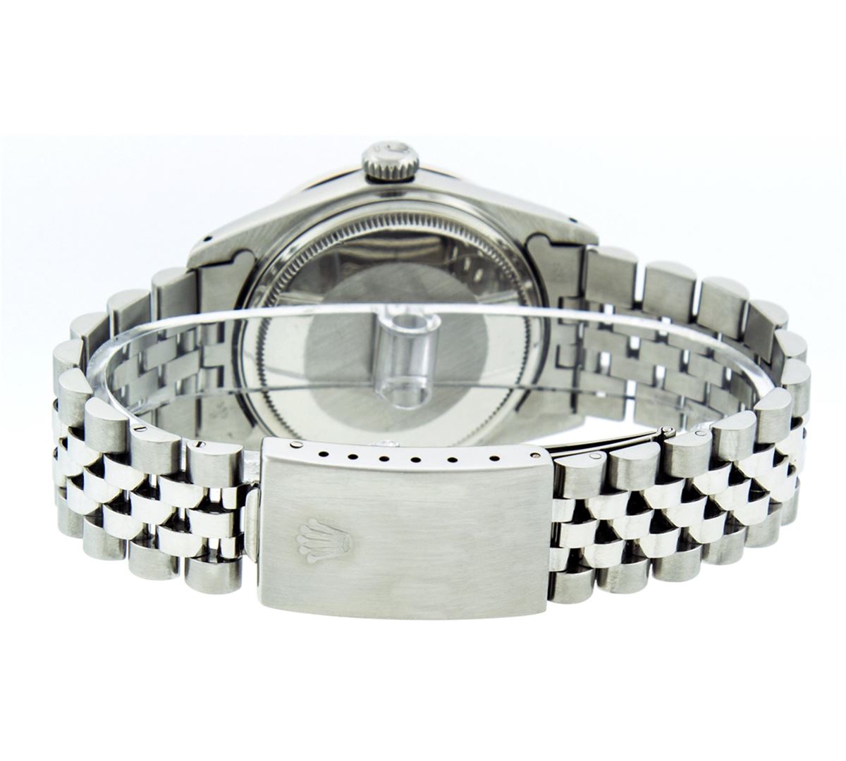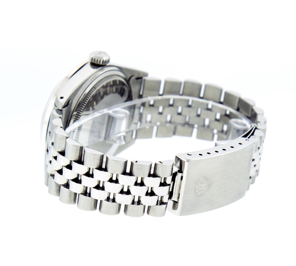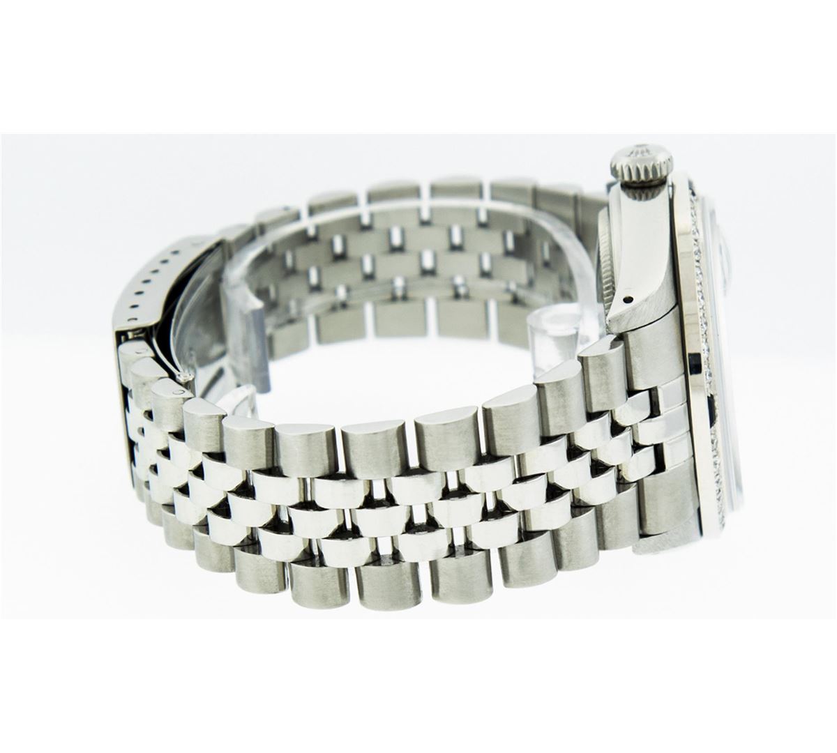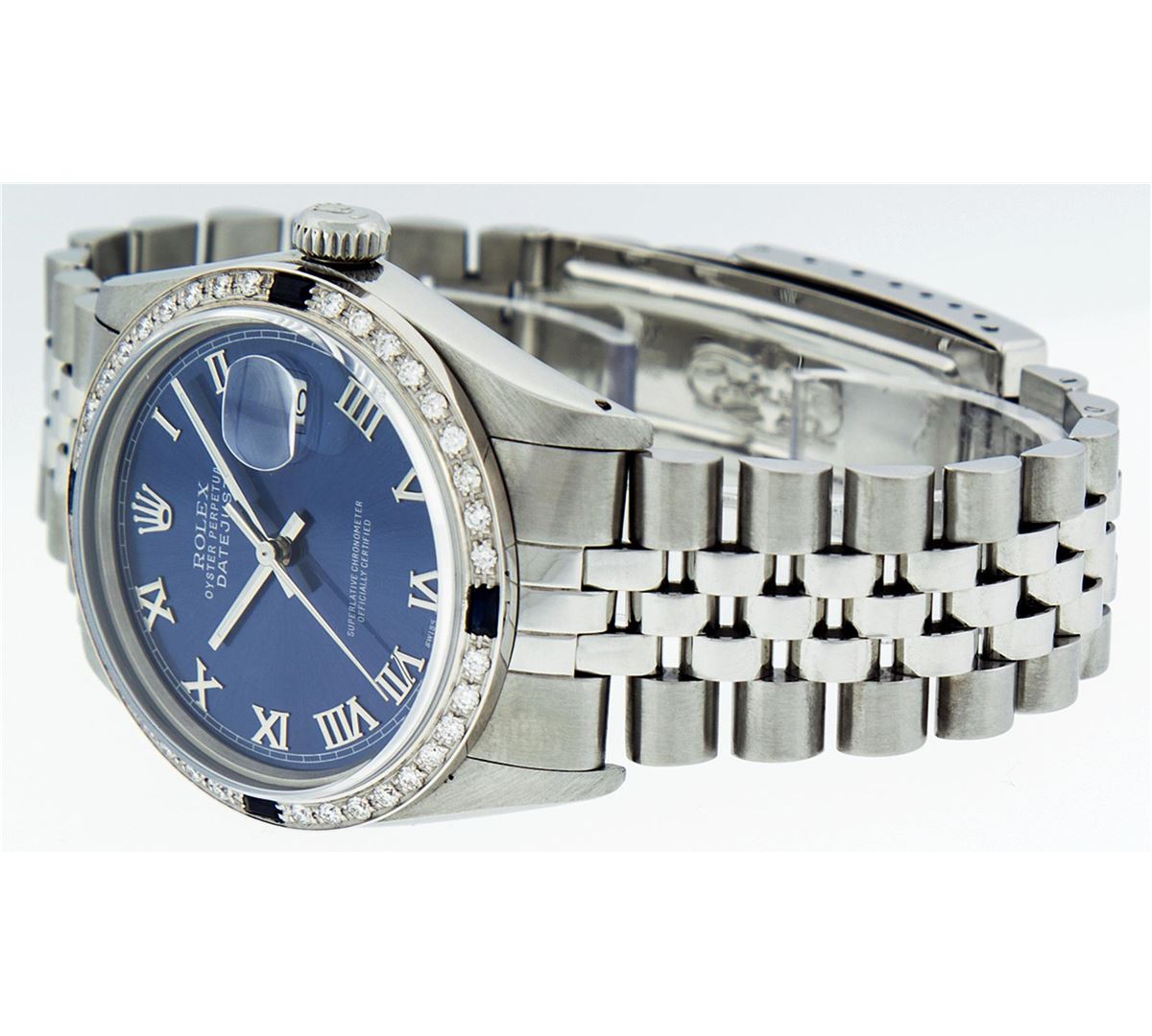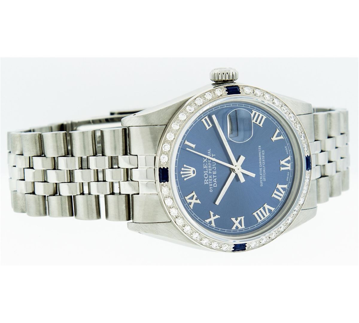 One Gents Rolex Datejust Polished, Serviced & Electronically Tested, Stainless Steel Case:36mm, Stainless Steel Crown, Custom Bezel: 18K White Gold Sapphire Beadset Diamond Bezel, Diamond + Gem Count: 36 Diamonds + 4 Sapphires Total Weight 1.00 Carat, Clarity: SI-VS, Color: G to H. Custom Crystal: Synthetic Sapphire Cyclops Lens. Movement: Automatic Winding Movement Caliber 3035. Custom Dial: Blue With Roman Hour Markers & Square Track. Date Window: 3 O'Clock Position Date Display, Quickset, Model: Datejust, Condition: G-6 Extra Fine. Bracelet: Stainless Steel Jubilee. Bright Polish & Satin Finish. 7.0 Inch Length, Adjustable. Standard Clasp, With Rolex Logo. Comes with a 6 month warranty card.