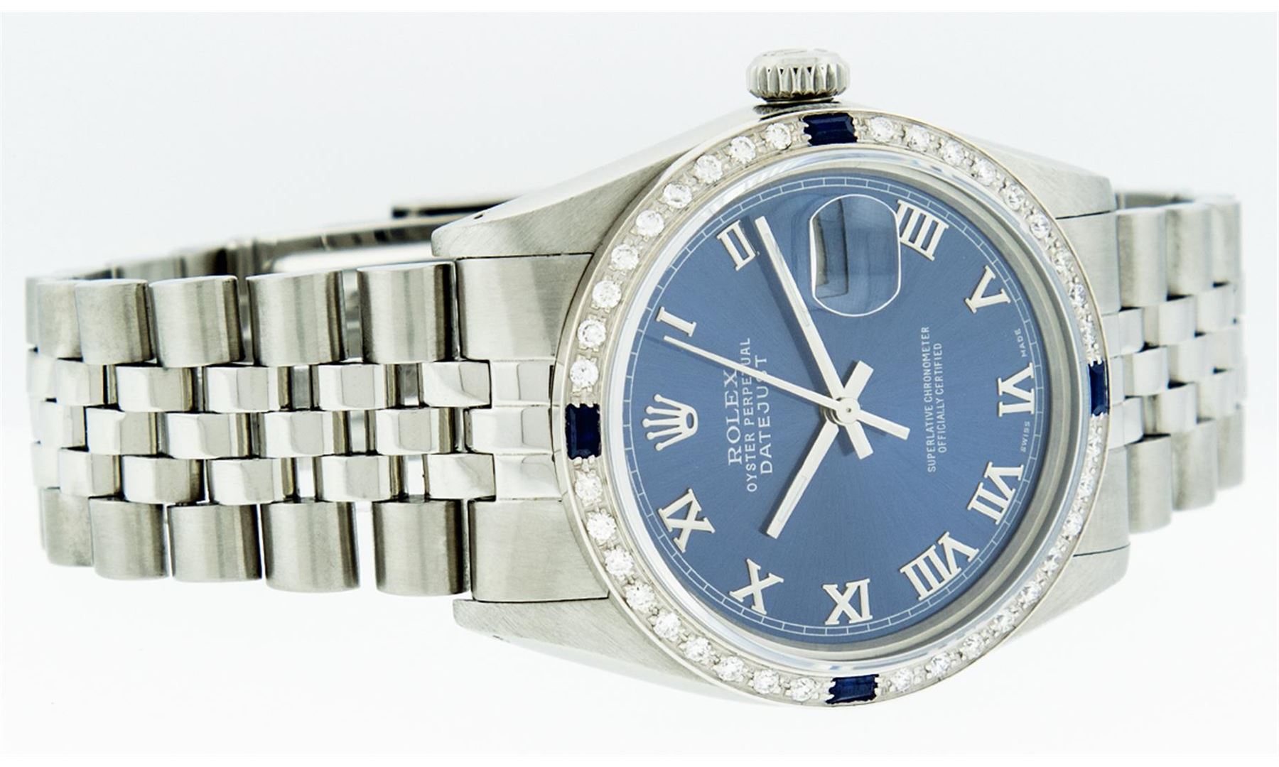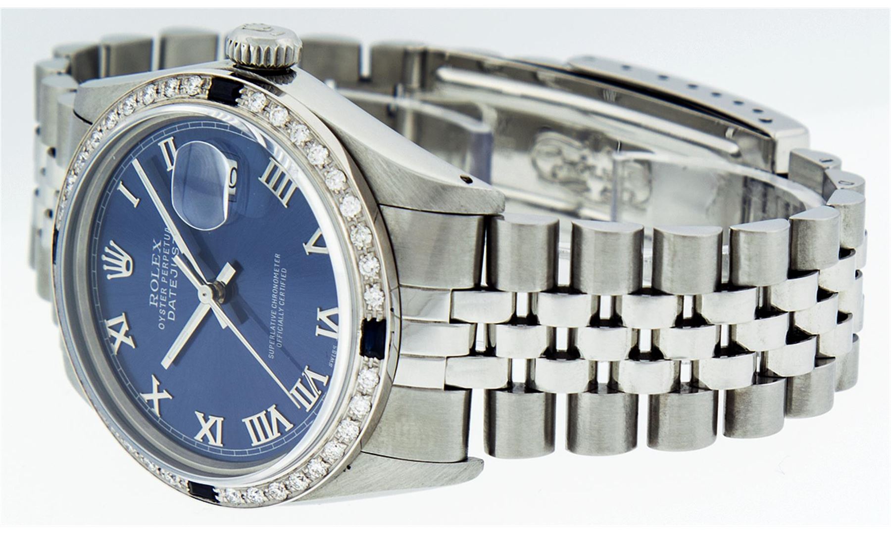 One Gents Rolex Datejust Polished, Serviced & Electronically Tested, Stainless Steel Case:36mm, Stainless Steel Crown, Custom Bezel: 18K White Gold Sapphire Beadset Diamond Bezel, Diamond + Gem Count: 36 Diamonds + 4 Sapphires Total Weight 1.00 Carat, Clarity: SI-VS, Color: G to H. Custom Crystal: Synthetic Sapphire Cyclops Lens. Movement: Automatic Winding Movement Caliber 3035. Custom Dial: Blue With Roman Hour Markers & Square Track. Date Window: 3 O'Clock Position Date Display, Quickset, Model: Datejust, Condition: G-6 Extra Fine. Bracelet: Stainless Steel Jubilee. Bright Polish & Satin Finish. 7.0 Inch Length, Adjustable. Standard Clasp, With Rolex Logo. Comes with a 6 month warranty card.