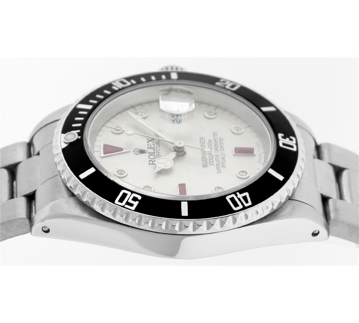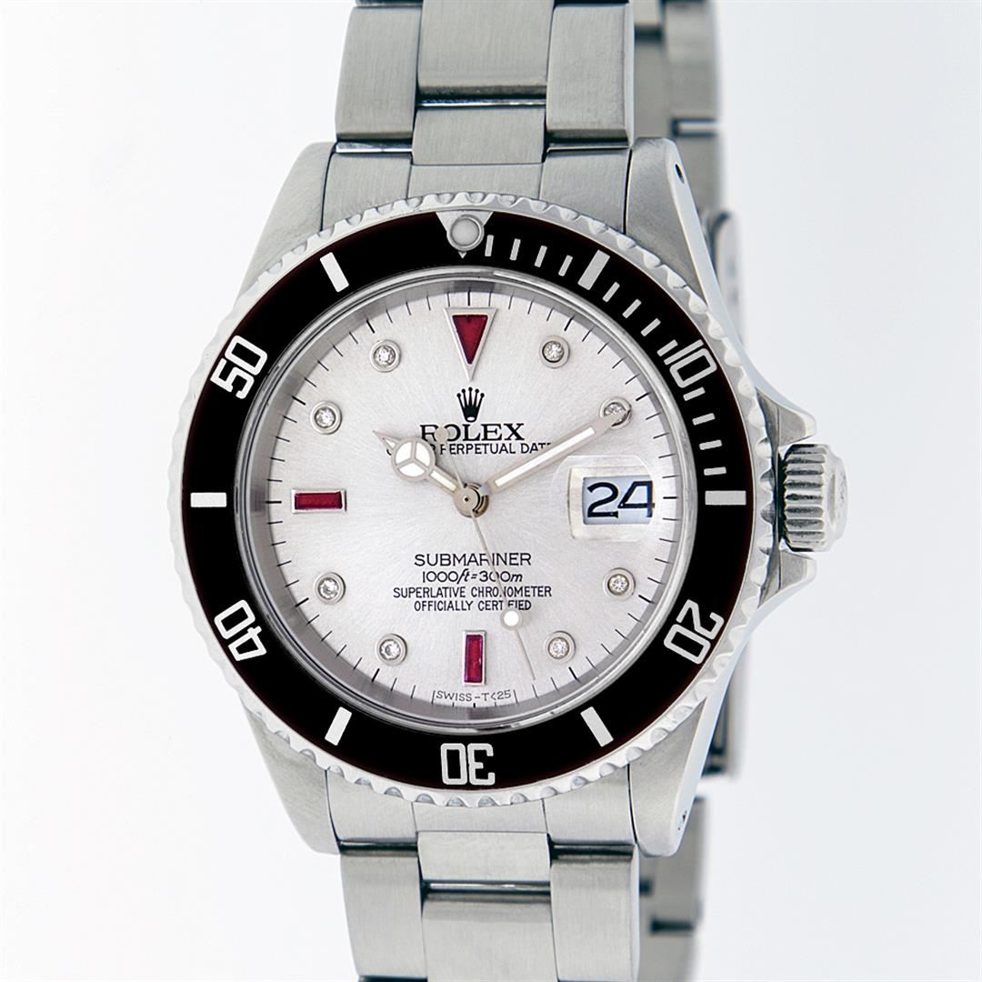 One Mens Rolex Submariner With Date Polished, Serviced & Electronically Tested, Stainless Steel Case:41mm, Stainless Steel Crown, Bezel: Stainless Steel Rotatable Bezel With Black Insert. Crystal: Synthetic Sapphire Cyclops Lens. Movement: Automatic Winding Movement Caliber 3135. Custom Dial: Silver Serti Diamond & Ruby Dial, Diamond Count: 8 Diamonds + 2 Baguette Ruby, Color: G To H, Clarity: SI-VS. Date Window: 3 O'Clock Position Date Display, Model: Submariner 16610, Quickset, Condition: G-6 Extra Fine. Bracelet: Stainless Steel Oyster. Bright Polish & Satin Finish. 7.0 Inch Length, Adjustable. Standard Clasp, With Rolex Logo. Comes with 6 month warranty.