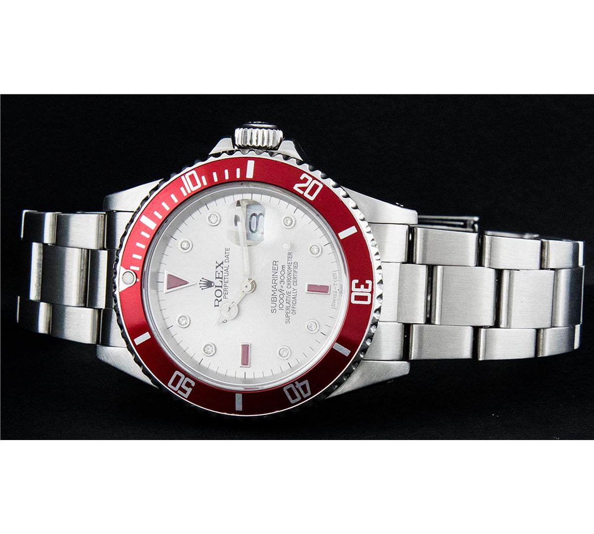 One Mens Rolex Submariner With Date Polished, Serviced & Electronically Tested, Stainless Steel Case:41mm, Stainless Steel Crown, Custom Bezel: Stainless Steel Rotatable Bezel With Red Insert. Crystal: Synthetic Sapphire Cyclops Lens. Movement: Automatic Winding Movement Caliber 3135. Custom Dial: Silver Serti Diamond & Ruby Dial, Diamond Count: 8 Diamonds + 2 Baguette Rubies, Color: G To H, Clarity: SI-VS. Date Window: 3 O'Clock Position Date Display, Model: Submariner 16610, Quickset, Condition: G-6 Extra Fine. Bracelet: Stainless Steel Oyster. Bright Polish & Satin Finish. 6.75 Inch Length, Adjustable. Standard Clasp, With Rolex Logo. Comes with 6 month warranty.