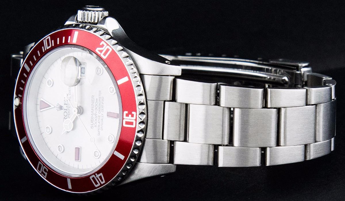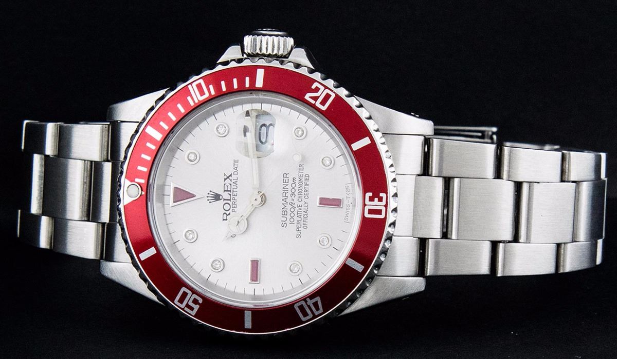 One Mens Rolex Submariner With Date Polished, Serviced & Electronically Tested, Stainless Steel Case:41mm, Stainless Steel Crown, Custom Bezel: Stainless Steel Rotatable Bezel With Red Insert. Crystal: Synthetic Sapphire Cyclops Lens. Movement: Automatic Winding Movement Caliber 3135. Custom Dial: Silver Serti Diamond & Ruby Dial, Diamond Count: 8 Diamonds + 2 Baguette Rubies, Color: G To H, Clarity: SI-VS. Date Window: 3 O'Clock Position Date Display, Model: Submariner 16610, Quickset, Condition: G-6 Extra Fine. Bracelet: Stainless Steel Oyster. Bright Polish & Satin Finish. 6.75 Inch Length, Adjustable. Standard Clasp, With Rolex Logo. Comes with 6 month warranty.