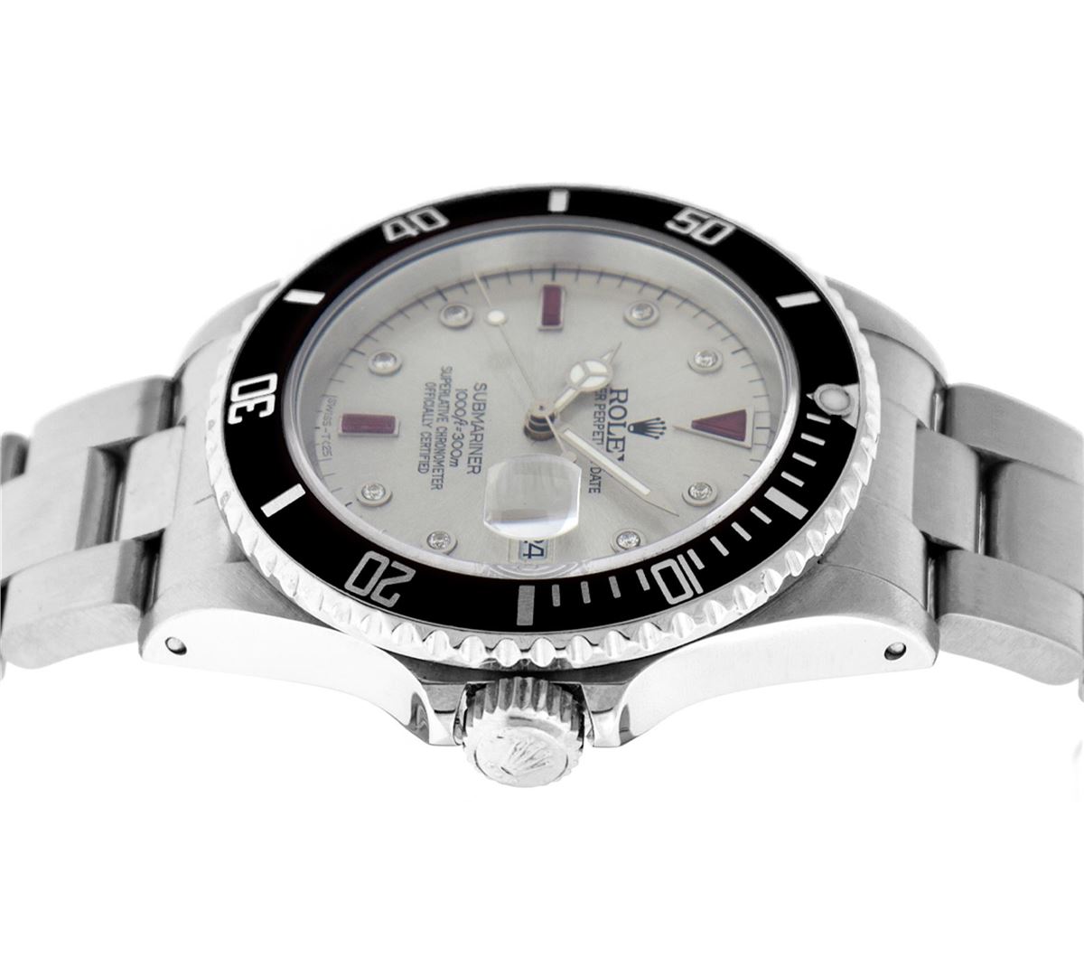 One Mens Rolex Submariner With Date Polished, Serviced & Electronically Tested, Stainless Steel Case:41mm, Stainless Steel Crown, Bezel: Stainless Steel Rotatable Bezel With Black Insert. Crystal: Synthetic Sapphire Cyclops Lens. Movement: Automatic Winding Movement Caliber 3135. Custom Dial: Silver Serti Diamond & Ruby Dial, Diamond Count: 8 Diamonds + 2 Baguette Ruby, Color: G To H, Clarity: SI-VS. Date Window: 3 O'Clock Position Date Display, Model: Submariner 16610, Quickset, Condition: G-6 Extra Fine. Bracelet: Stainless Steel Oyster. Bright Polish & Satin Finish. 7.0 Inch Length, Adjustable. Standard Clasp, With Rolex Logo. Comes with 6 month warranty.