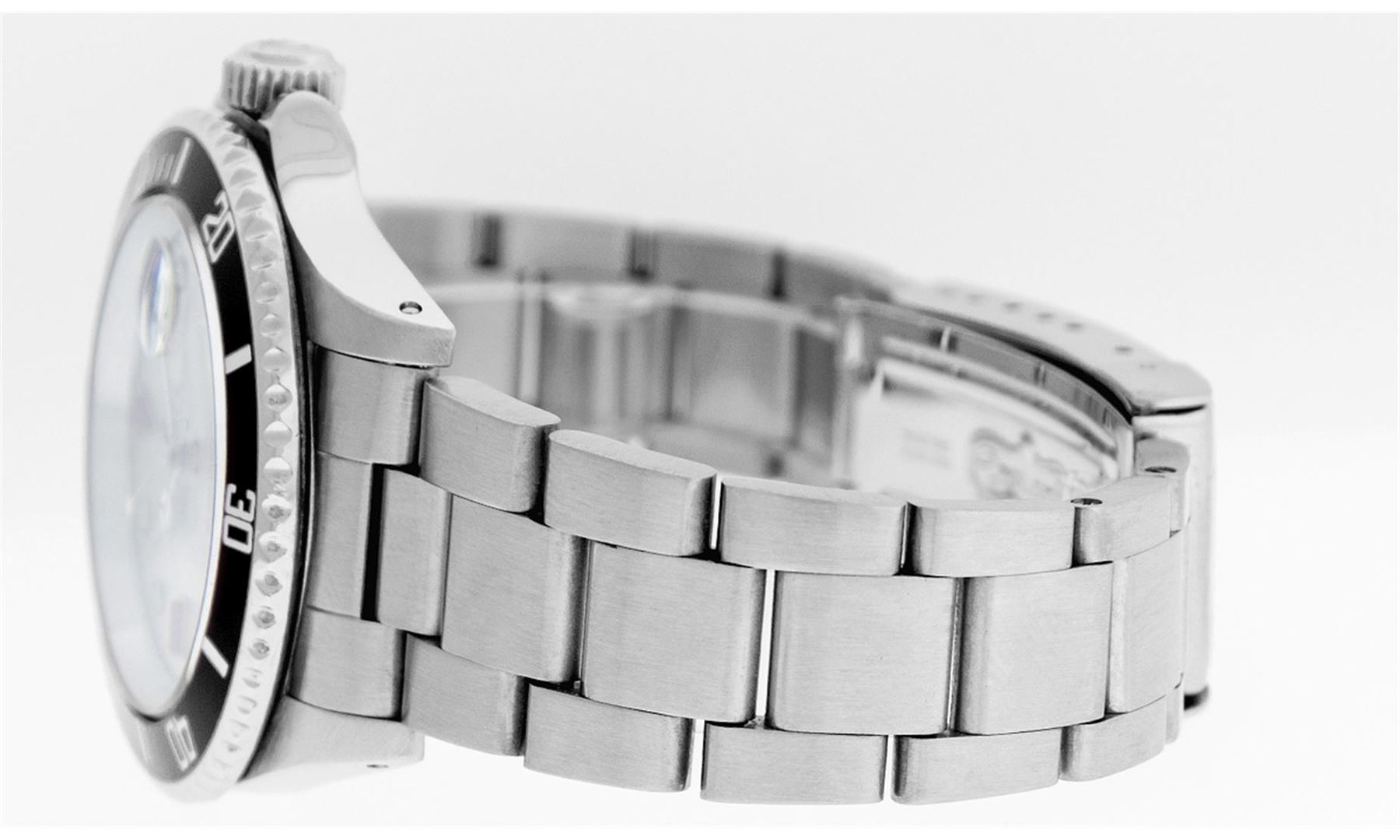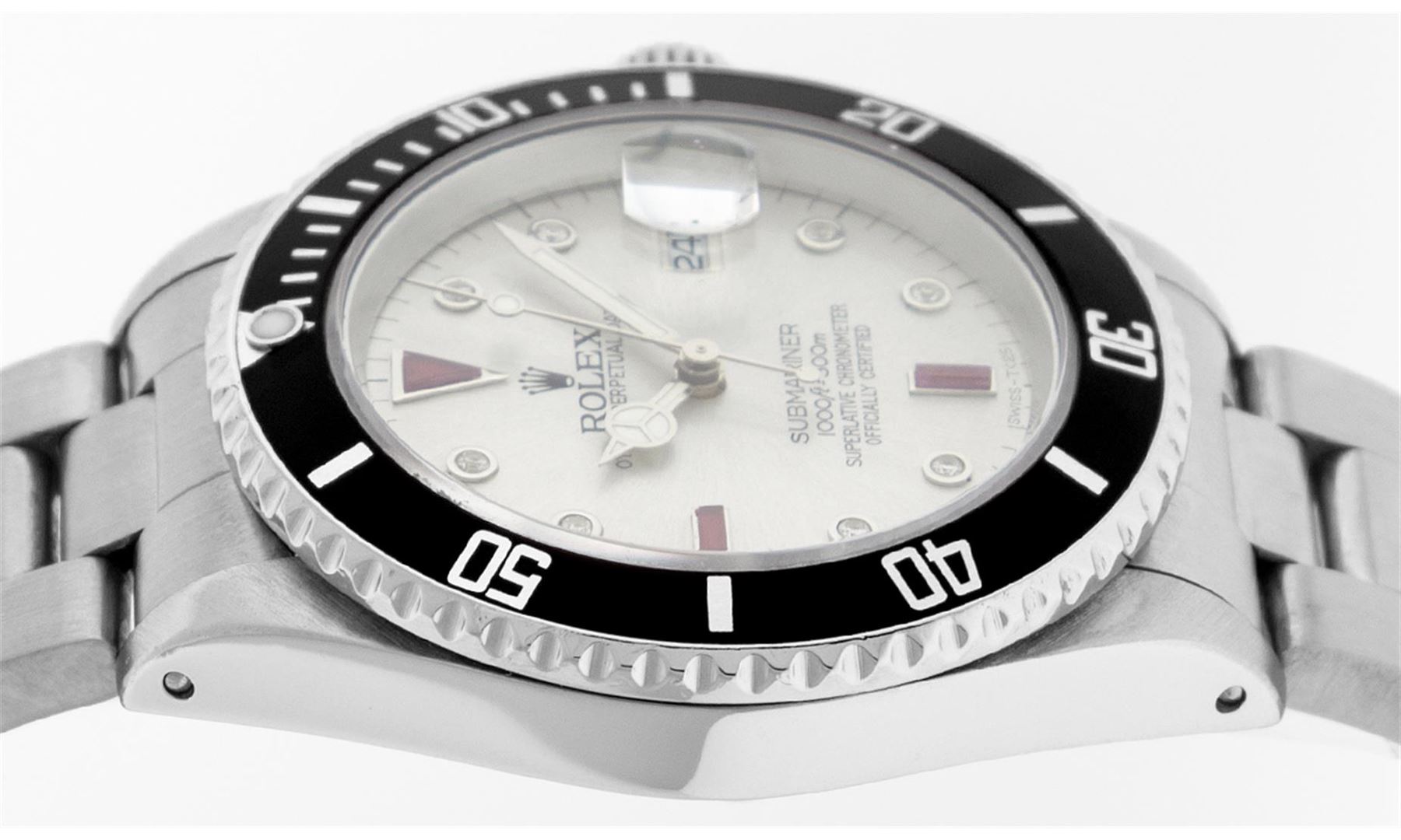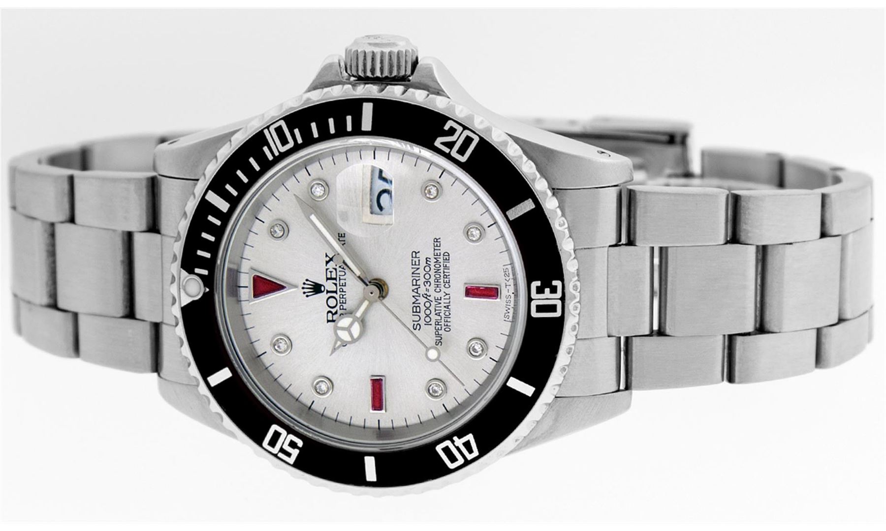 One Mens Rolex Submariner With Date Polished, Serviced & Electronically Tested, Stainless Steel Case:41mm, Stainless Steel Crown, Bezel: Stainless Steel Rotatable Bezel With Black Insert. Crystal: Synthetic Sapphire Cyclops Lens. Movement: Automatic Winding Movement Caliber 3135. Custom Dial: Silver Serti Diamond & Ruby Dial, Diamond Count: 8 Diamonds + 2 Baguette Ruby, Color: G To H, Clarity: SI-VS. Date Window: 3 O'Clock Position Date Display, Model: Submariner 16610, Quickset, Condition: G-6 Extra Fine. Bracelet: Stainless Steel Oyster. Bright Polish & Satin Finish. 7.0 Inch Length, Adjustable. Standard Clasp, With Rolex Logo. Comes with 6 month warranty.