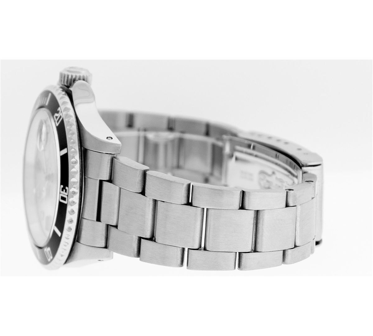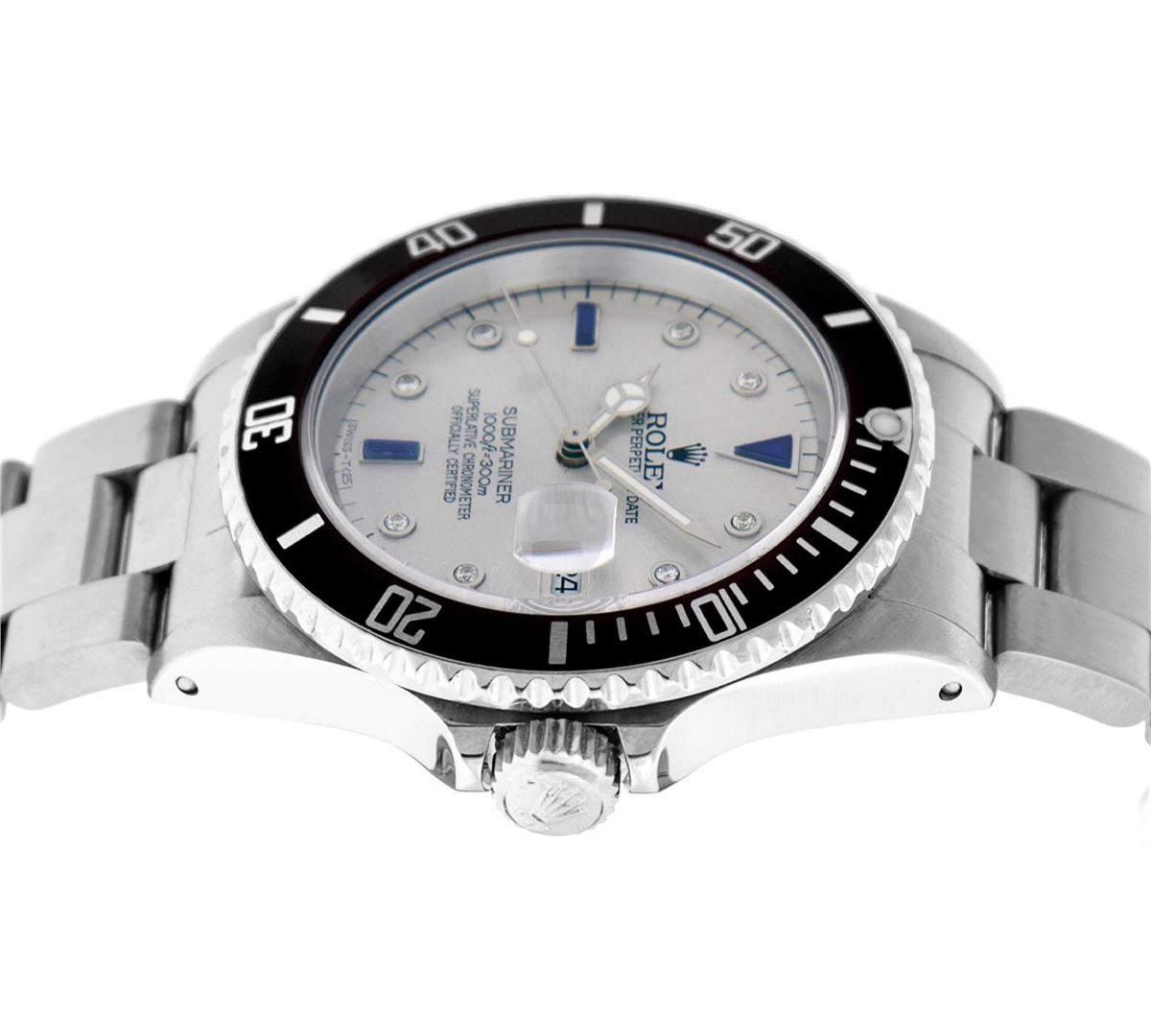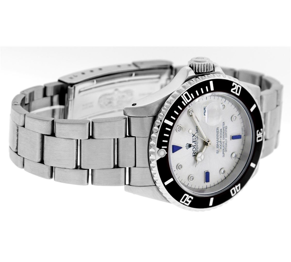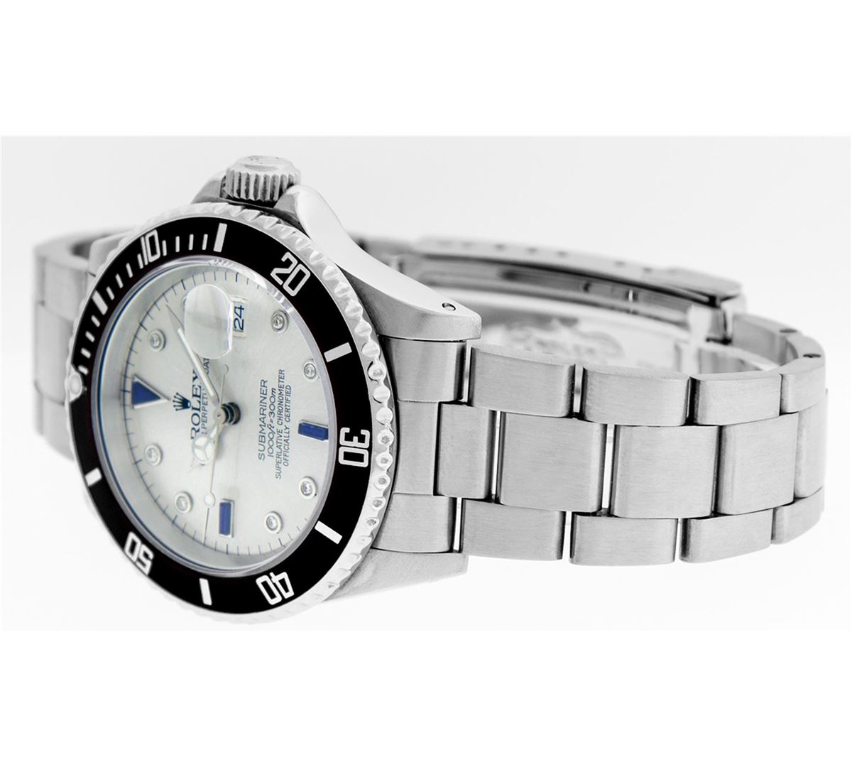 One Mens Rolex Submariner With Date Polished, Serviced & Electronically Tested, Stainless Steel Case:41mm, Stainless Steel Crown, Bezel: Stainless Steel Rotatable Bezel With Black Insert. Crystal: Synthetic Sapphire Cyclops Lens. Movement: Automatic Winding Movement Caliber 3135. Custom Dial: Silver Serti Diamond & Sapphire Dial, Diamond Count: 8 Diamonds + 2 Baguette Sapphire, Color: G To H, Clarity: SI-VS. Date Window: 3 O'Clock Position Date Display, Model: Submariner 16610, Quickset, Condition: G-6 Extra Fine. Bracelet: Stainless Steel Oyster. Bright Polish & Satin Finish. 7.0 Inch Length, Adjustable. Standard Clasp, With Rolex Logo. Comes with 6 month warranty.