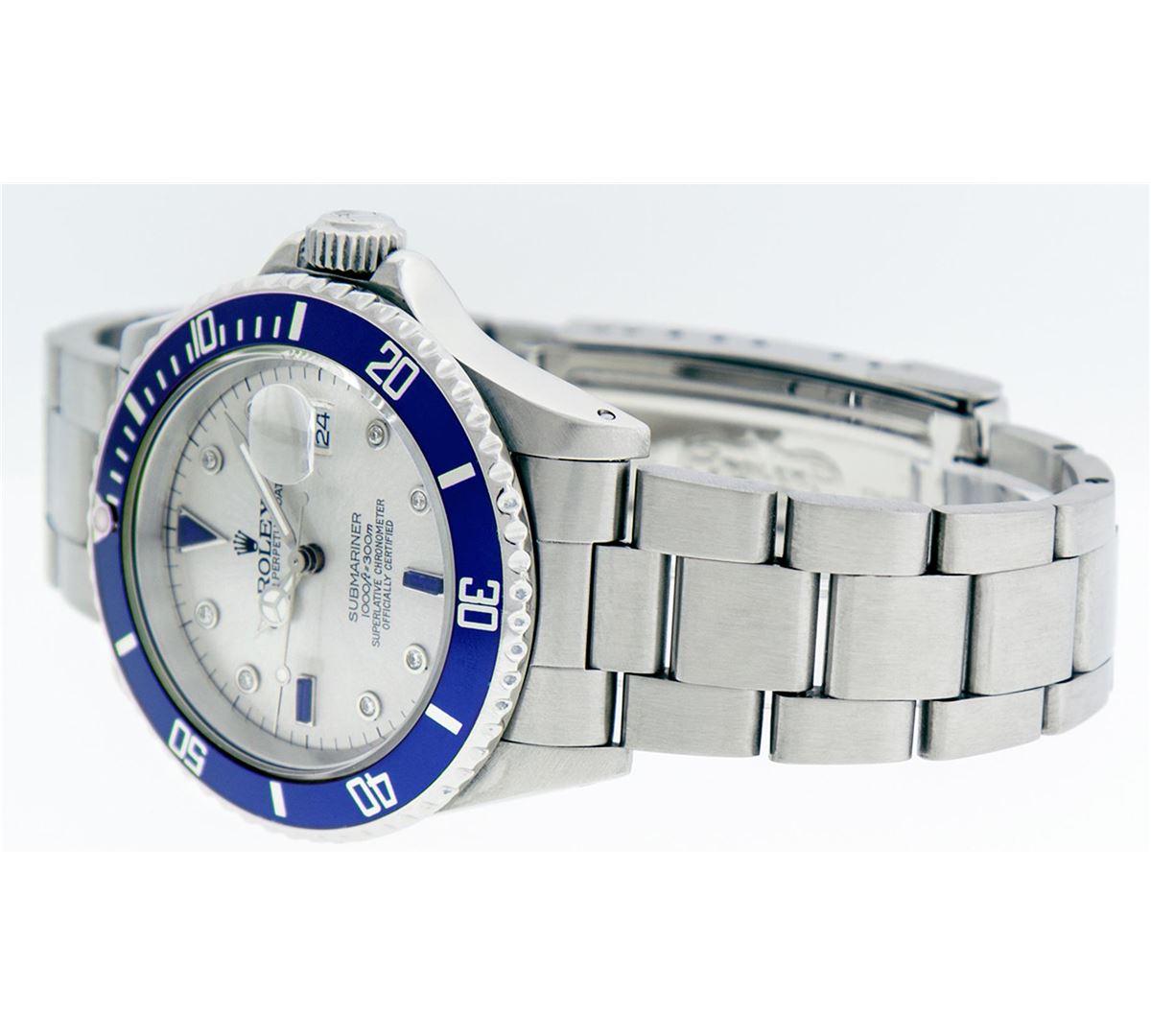 One Mens Rolex Submariner With Date Polished, Serviced & Electronically Tested, Stainless Steel Case:41mm, Stainless Steel Crown, Custom Bezel: Stainless Steel Rotatable Bezel With Blue Insert. Crystal: Synthetic Sapphire Cyclops Lens. Movement: Automatic Winding Movement Caliber 3135. Custom Dial: Silver Serti Diamond & Sapphire Dial, Diamond Count: 8 Diamonds + 2 Baguette Sapphires, Color: G To H, Clarity: SI-VS. Date Window: 3 O'Clock Position Date Display, Model: Submariner 16610, Quickset, Condition: G-6 Extra Fine. Bracelet: Stainless Steel Oyster. Bright Polish & Satin Finish. 7.0 Inch Length, Adjustable. Standard Clasp, With Rolex Logo. Comes with 6 month warranty.