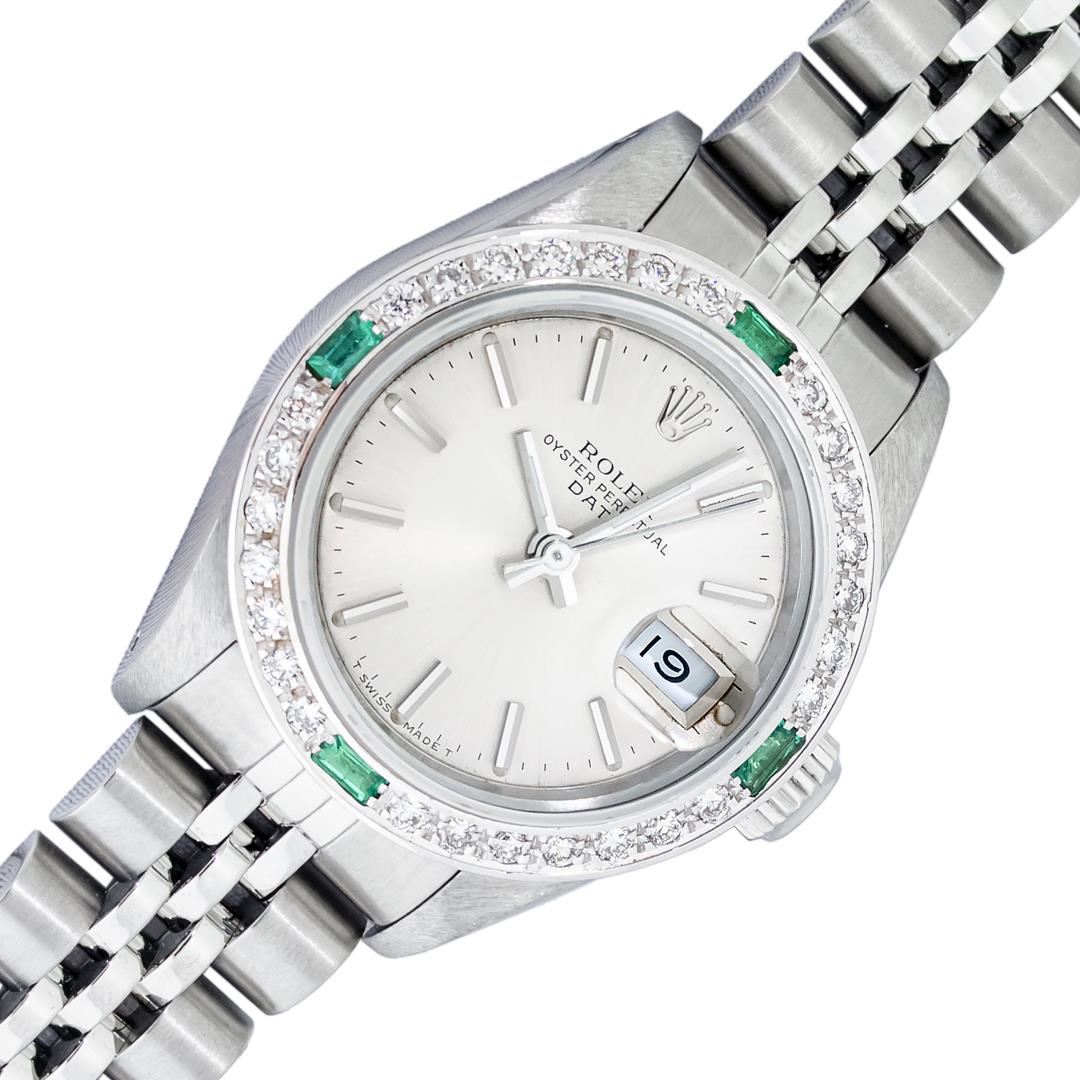 One Ladies Pre Owned Quickset Stainless Steel Rolex Date Polished Bright with Satin Finish Serviced & Electronically Tested, Rolex Stainless Steel Case: 26mm, Rolex Stainless Steel Crown, Custom Bezel: New White Gold Beadset + Emerald Diamond Bezel, Diamond Count: 28 Diamonds + 4 Emeralds. Custom Crystal: New Sapphire With Date Window. Custom Hands: New Luminescent Hands. Rolex Movement: Automatic Winding Movement. Rolex Dial: Silver Index Dial With Dash Track And Lumi Dot. Date Window: 3 O'Clock Position Date Display, Model: Datejust. Condition: G-6 Extra Fine. Rolex Bracelet: Stainless Steel Jubilee Band With Rolex Crown On Buckle. Bright Polish & Satin Finish. Band Length: 6.0 Inch Length, Adjustable. Standard Clasp, With Rolex Logo. This Watch Has Been Serviced Time Tested And Is In Excellent Condition It Is Free Of All Scratches And Dents.