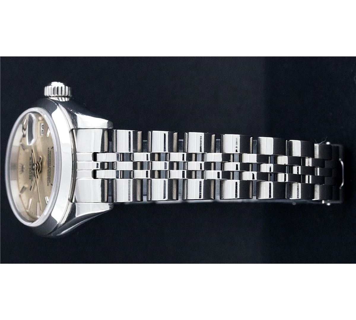 One Ladies Rolex Datejust Polished Bright with Satin Finish, Serviced & Electronically Tested, Stainless Steel No Hole Case:26mm, Stainless Steel Crown, Bezel: Stainless Steel Smooth. Crystal: Synthetic Sapphire Cyclops Lens. Movement: Automatic Winding Movement Caliber 2235. Dial: Silver Index Hour Markers. Date Window: 3 O'Clock Position Date Display, Quickset, Model: Datejust, Condition: G-6 Extra Fine. Bracelet: Stainless Steel Jubilee. Bright Polish & Satin Finish. 6.0 Inch Length, Adjustable. Standard Clasp, With Rolex Logo.