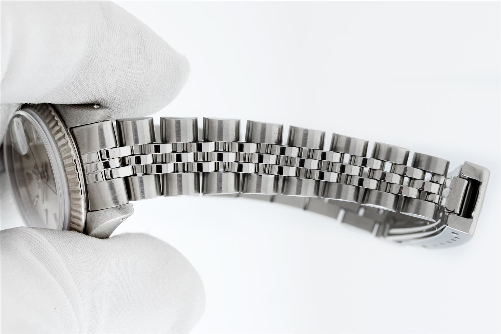 One Ladies Pre Owned Stainless Steel Rolex Datejust Polished Bright with Satin Finish, Serviced & Electronically Tested, Rolex Stainless Steel Case: 26mm, Rolex Stainless Steel Crown, Rolex Bezel: White Gold Fluted Bezel, Custom Crystal: New With Magnifying Date Window. Rolex Hands: Luminescent Hands. Rolex Movement: Automatic Winding Movement. Rolex Dial: Silver Dial With Index Hour Markers And Lumi Dots. Date Window: 3 O'Clock Position Date Display, Model: Datejust. Condition: G-6 Extra Fine. Rolex Bracelet: Stainless Steel Jubilee Band. Bright Polish & Satin Finish. 6.0 Inch Length, Adjustable. Standard Clasp, With Rolex Logo. This Watch Has Been Serviced Time Tested And Is In Excellent Condition It Is Free Of All Scratches And Dents. This Watch Comes With A Rolex Box And Booklets.