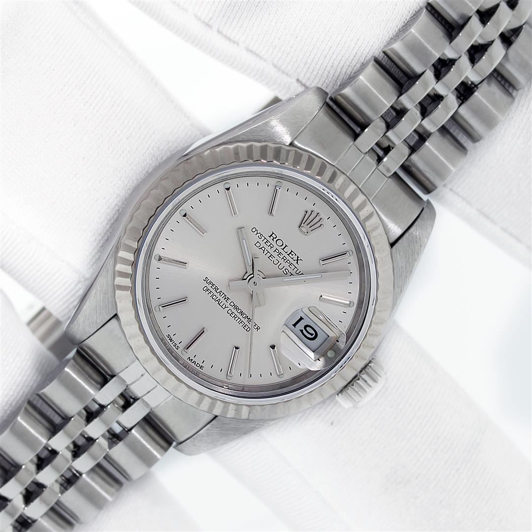 One Ladies Pre Owned Stainless Steel Rolex Datejust Polished Bright with Satin Finish, Serviced & Electronically Tested, Rolex Stainless Steel Case: 26mm, Rolex Stainless Steel Crown, Rolex Bezel: White Gold Fluted Bezel, Custom Crystal: New With Magnifying Date Window. Rolex Hands: Luminescent Hands. Rolex Movement: Automatic Winding Movement. Rolex Dial: Silver Dial With Index Hour Markers And Lumi Dots. Date Window: 3 O'Clock Position Date Display, Model: Datejust. Condition: G-6 Extra Fine. Rolex Bracelet: Stainless Steel Jubilee Band. Bright Polish & Satin Finish. 6.0 Inch Length, Adjustable. Standard Clasp, With Rolex Logo. This Watch Has Been Serviced Time Tested And Is In Excellent Condition It Is Free Of All Scratches And Dents. This Watch Comes With A Rolex Box And Booklets.