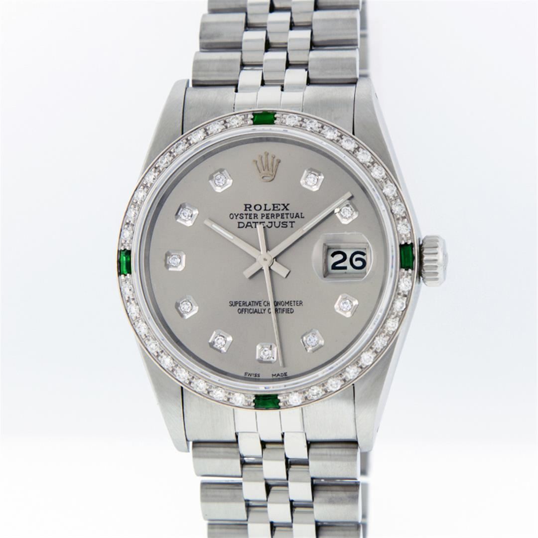 One Gents Rolex Datejust Polished, Serviced & Electronically Tested, Stainless Steel Case:36mm, Stainless Steel Crown, Custom Bezel: 18K White Gold Emerald Beadset Diamond Bezel, Diamond + Gem Count: 36 Diamonds + 4 Emeralds Total Weight 1.00 Carat, Clarity: SI-VS, Color: G to H. Custom Crystal: Synthetic Sapphire Cyclops Lens. Movement: Automatic Winding Movement Caliber 3035. Custom Dial: Slate Grey With Diamond Hour Markers, 10 Diamond Dial G To H In Color, Clarity: SI-VS. Date Window: 3 O'Clock Position Date Display, Quickset, Model: Datejust, Condition: G-6 Extra Fine. Bracelet: Stainless Steel Jubilee. Bright Polish & Satin Finish. 7.0 Inch Length, Adjustable. Standard Clasp, With Rolex Logo Comes with a 6 month warranty card.