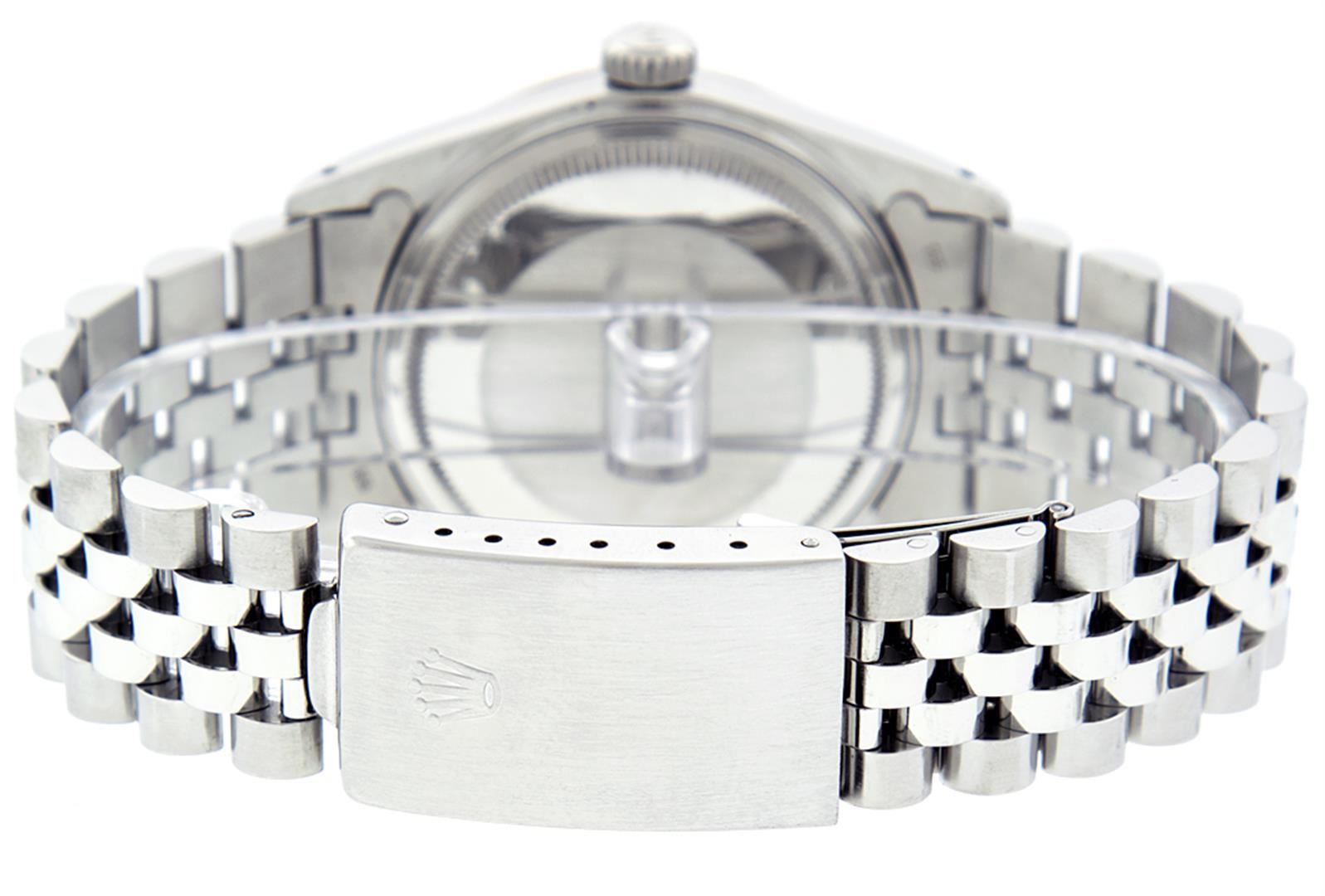 One Gents Rolex Datejust Polished, Serviced & Electronically Tested, Stainless Steel Case:36mm, Stainless Steel Crown, Custom Bezel: 18K White Gold Emerald Beadset Diamond Bezel, Diamond + Gem Count: 36 Diamonds + 4 Emeralds Total Weight 1.00 Carat, Clarity: SI-VS, Color: G to H. Custom Crystal: Synthetic Sapphire Cyclops Lens. Movement: Automatic Winding Movement Caliber 3035. Custom Dial: Slate Grey With Diamond Hour Markers, 10 Diamond Dial G To H In Color, Clarity: SI-VS. Date Window: 3 O'Clock Position Date Display, Quickset, Model: Datejust, Condition: G-6 Extra Fine. Bracelet: Stainless Steel Jubilee. Bright Polish & Satin Finish. 7.0 Inch Length, Adjustable. Standard Clasp, With Rolex Logo Comes with a 6 month warranty card.