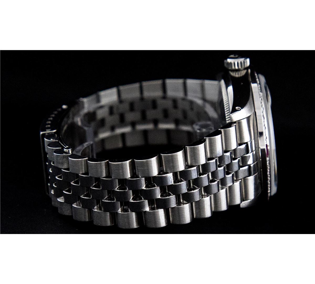 One Mens Rolex Datejust Polished Bright with Satin Finish, Serviced & Electronically Tested, Stainless Steel Case:36mm, 14K Stainless Steel Crown, Custom Bezel: 18K White Gold Ruby Beadset Diamond Bezel, Diamond + Gem Count: 36 Diamonds + 4 Rubys Total Weight 1.00 Carat, Clarity: Si-VS, Color: G to H. Custom Crystal: Synthetic Sapphire Cyclops Lens. Movement: Automatic Winding Movement Caliber 3035. Custom Dial: Slate Grey Dial Set With Diamond Hour Markers, 10 Diamond in Dial G To H In Color, Si-VS Clarity. Date Window: 3 O'Clock Position Date Display, Quickset, Model: 16014 Condition: G-6 Extra Fine. Bracelet: Stainless Steel Jubilee. Bright Polish & Satin Finish. 7.0 Inch Length, Adjustable. Standard Clasp, With Rolex Logo.