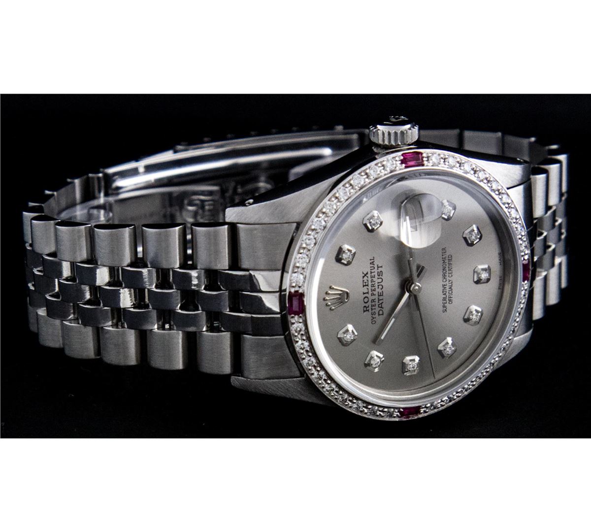 One Mens Rolex Datejust Polished Bright with Satin Finish, Serviced & Electronically Tested, Stainless Steel Case:36mm, 14K Stainless Steel Crown, Custom Bezel: 18K White Gold Ruby Beadset Diamond Bezel, Diamond + Gem Count: 36 Diamonds + 4 Rubys Total Weight 1.00 Carat, Clarity: Si-VS, Color: G to H. Custom Crystal: Synthetic Sapphire Cyclops Lens. Movement: Automatic Winding Movement Caliber 3035. Custom Dial: Slate Grey Dial Set With Diamond Hour Markers, 10 Diamond in Dial G To H In Color, Si-VS Clarity. Date Window: 3 O'Clock Position Date Display, Quickset, Model: 16014 Condition: G-6 Extra Fine. Bracelet: Stainless Steel Jubilee. Bright Polish & Satin Finish. 7.0 Inch Length, Adjustable. Standard Clasp, With Rolex Logo.