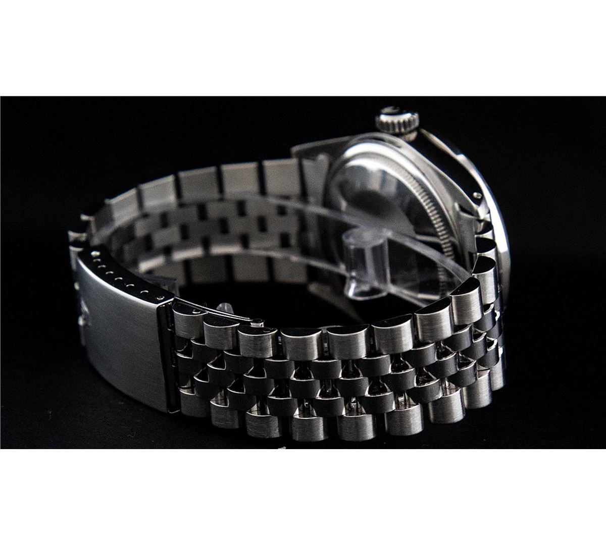One Mens Rolex Datejust Polished Bright with Satin Finish, Serviced & Electronically Tested, Stainless Steel Case:36mm, 14K Stainless Steel Crown, Custom Bezel: 18K White Gold Ruby Beadset Diamond Bezel, Diamond + Gem Count: 36 Diamonds + 4 Rubys Total Weight 1.00 Carat, Clarity: Si-VS, Color: G to H. Custom Crystal: Synthetic Sapphire Cyclops Lens. Movement: Automatic Winding Movement Caliber 3035. Custom Dial: Slate Grey Dial Set With Diamond Hour Markers, 10 Diamond in Dial G To H In Color, Si-VS Clarity. Date Window: 3 O'Clock Position Date Display, Quickset, Model: 16014 Condition: G-6 Extra Fine. Bracelet: Stainless Steel Jubilee. Bright Polish & Satin Finish. 7.0 Inch Length, Adjustable. Standard Clasp, With Rolex Logo.
