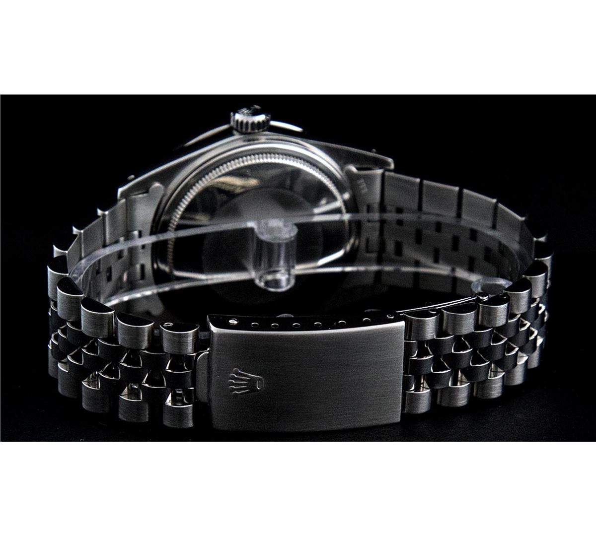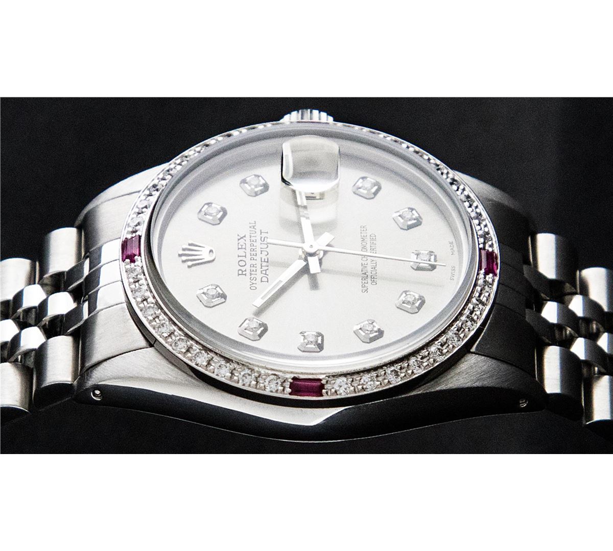 One Mens Rolex Datejust Polished Bright with Satin Finish, Serviced & Electronically Tested, Stainless Steel Case:36mm, 14K Stainless Steel Crown, Custom Bezel: 18K White Gold Ruby Beadset Diamond Bezel, Diamond + Gem Count: 36 Diamonds + 4 Rubys Total Weight 1.00 Carat, Clarity: Si-VS, Color: G to H. Custom Crystal: Synthetic Sapphire Cyclops Lens. Movement: Automatic Winding Movement Caliber 3035. Custom Dial: Slate Grey Dial Set With Diamond Hour Markers, 10 Diamond in Dial G To H In Color, Si-VS Clarity. Date Window: 3 O'Clock Position Date Display, Quickset, Model: 16014 Condition: G-6 Extra Fine. Bracelet: Stainless Steel Jubilee. Bright Polish & Satin Finish. 7.0 Inch Length, Adjustable. Standard Clasp, With Rolex Logo.