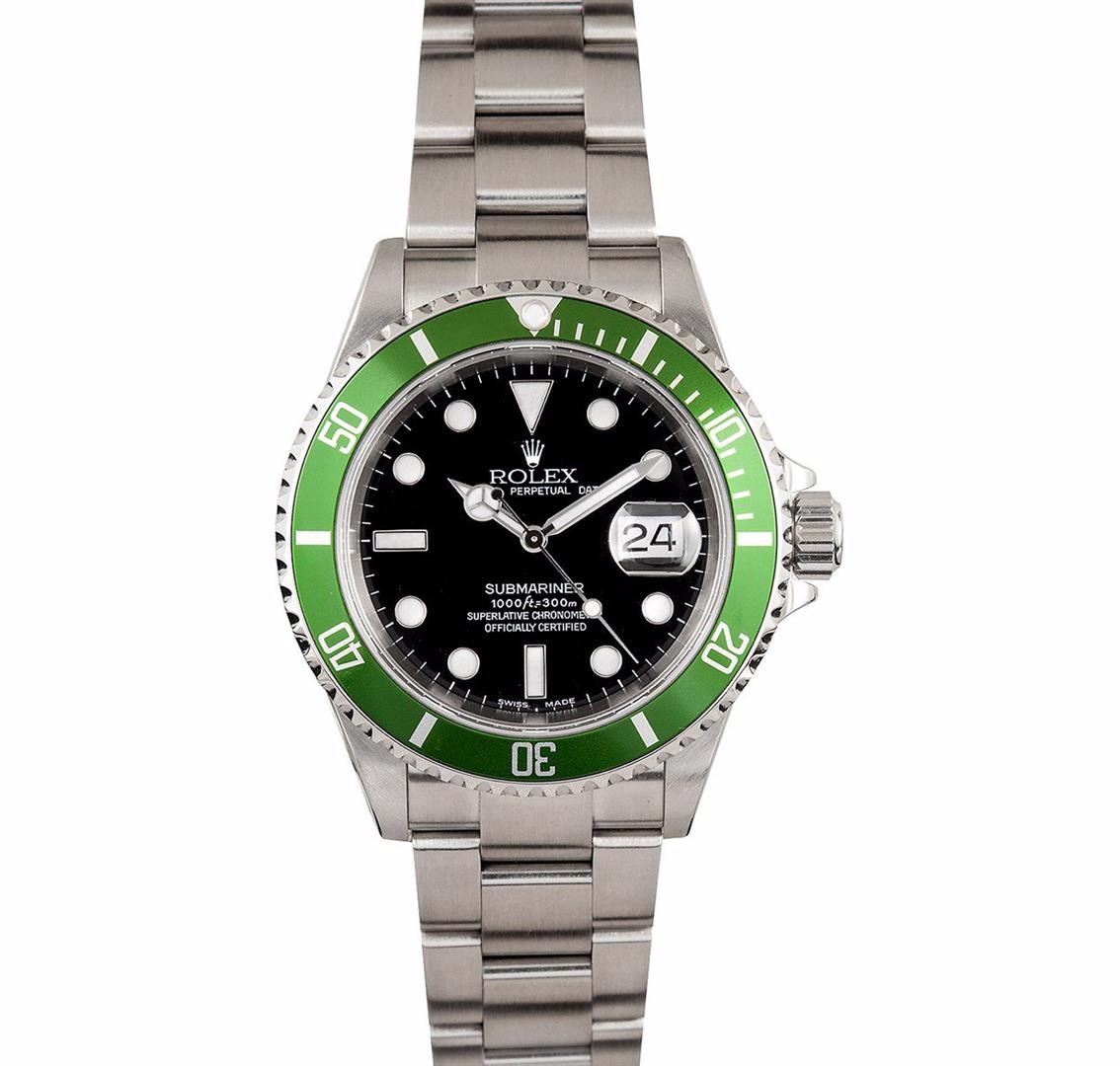One gents stainless steel Rolex Submariner Anniversary Edition wristwatch. Model Name/Number: Submariner 16610v. The watch features automatic movement with date, waterproof screw-down crown, unidirectional rotatable diver's bezel, scratch-resistant sapphire crystal. Case: Stainless steel with green anniversary edition bezel, no holes case. Dial: Black with luminous markers. Bracelet: Stainless Steel Oyster.
