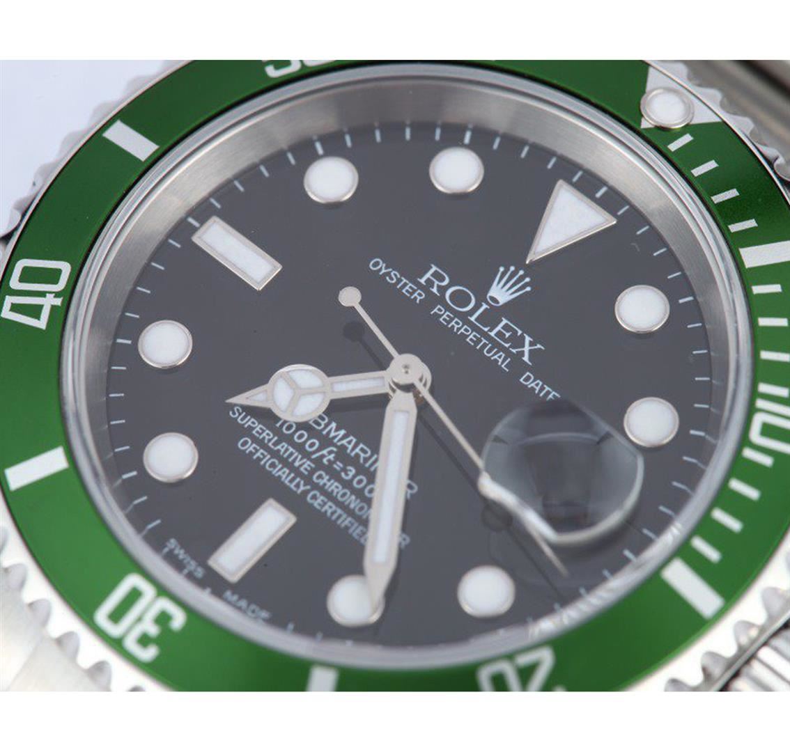 One gents stainless steel Rolex Submariner Anniversary Edition wristwatch. Model Name/Number: Submariner 16610v. The watch features automatic movement with date, waterproof screw-down crown, unidirectional rotatable diver's bezel, scratch-resistant sapphire crystal. Case: Stainless steel with green anniversary edition bezel, no holes case. Dial: Black with luminous markers. Bracelet: Stainless Steel Oyster.
